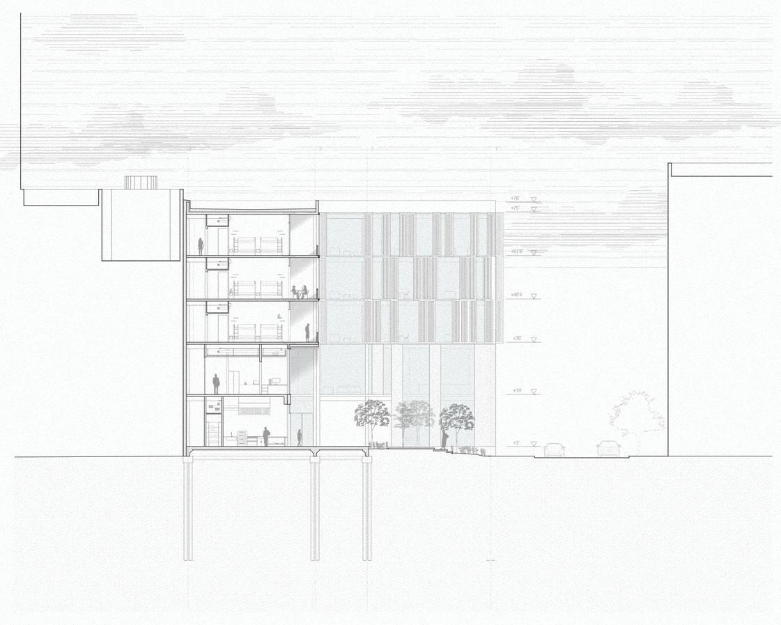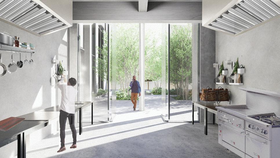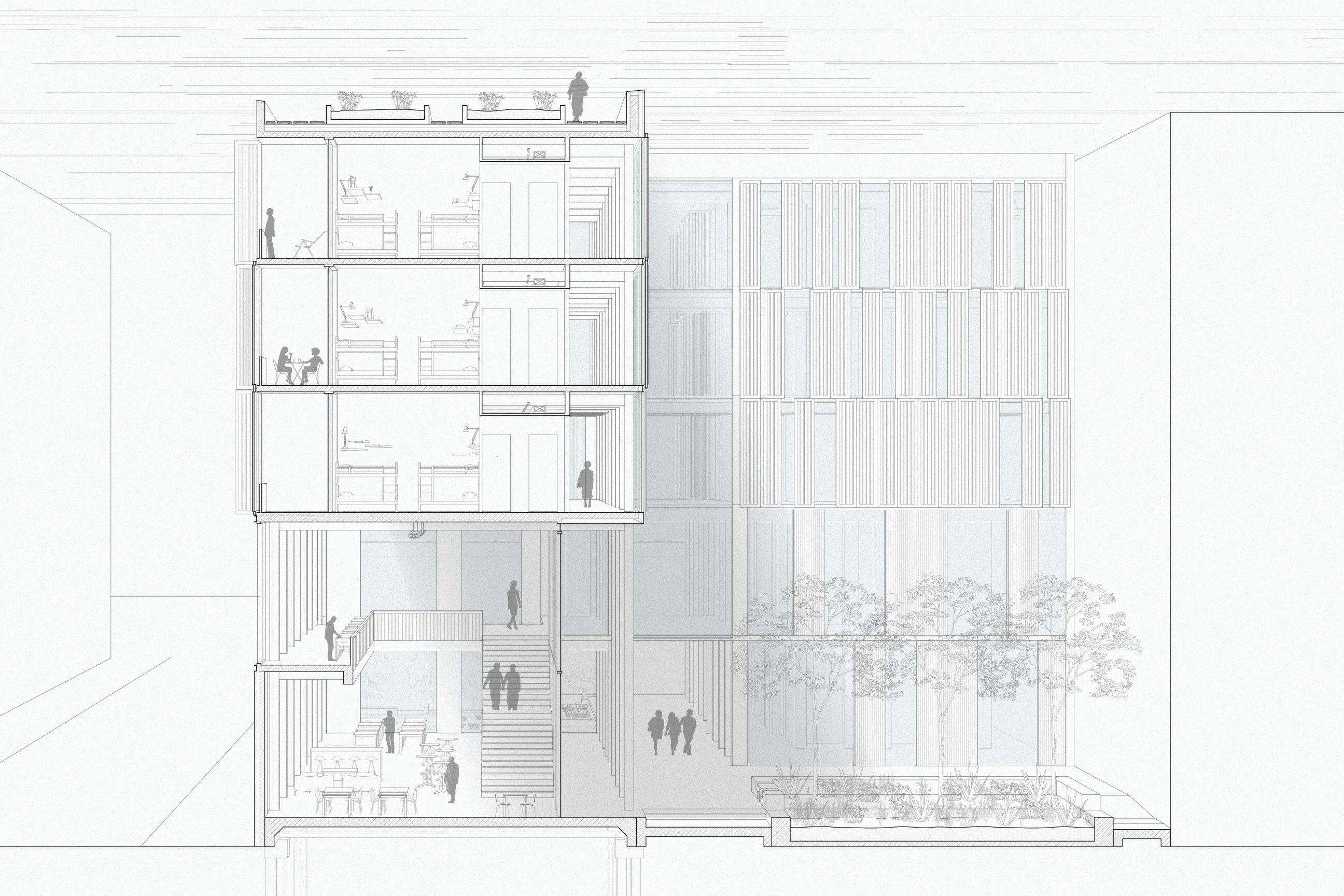 Section perspective through the dining room, Experiential plaza, and hostel rooms