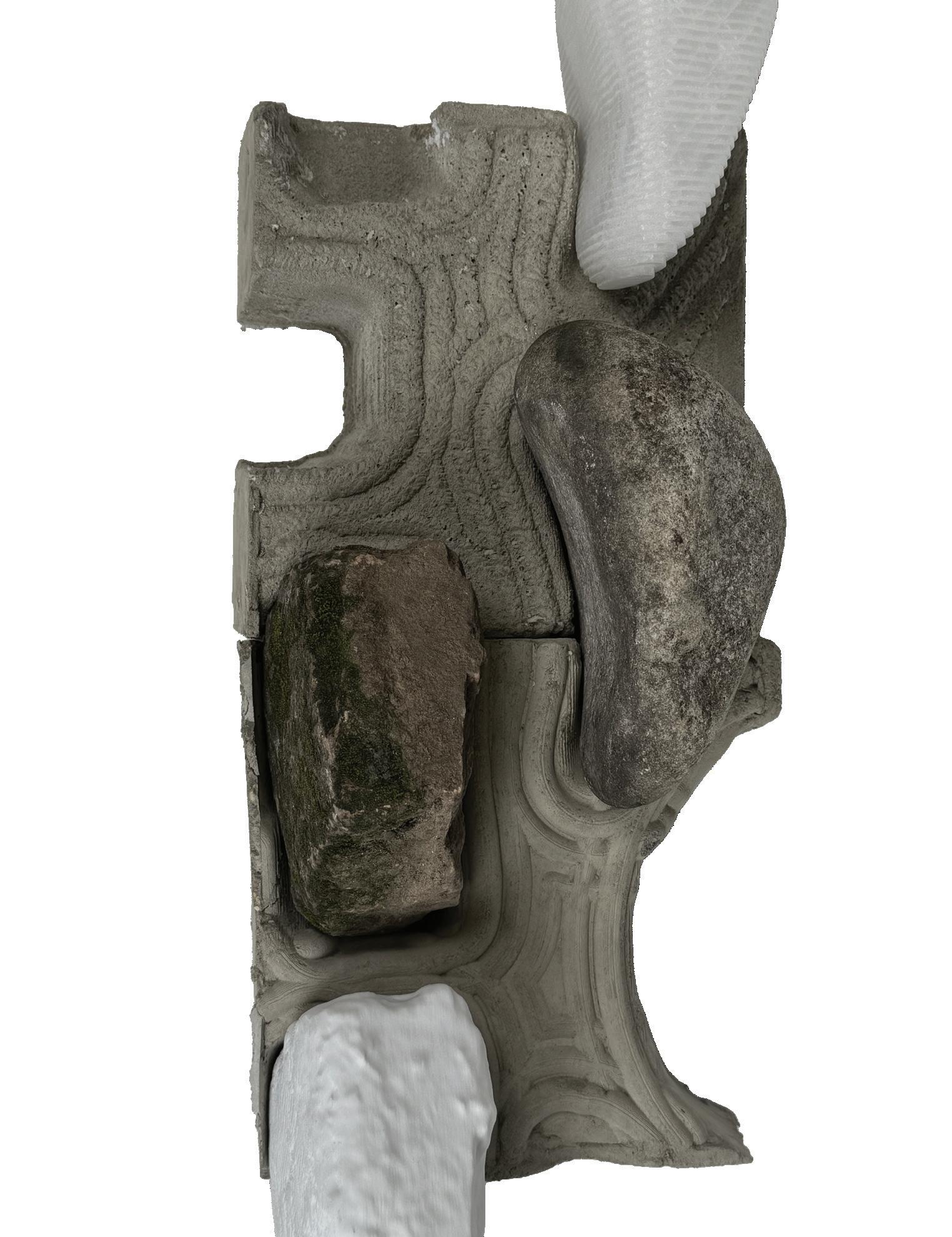 This prototypical model explores the concept of ‘stone stitching’ by creating custom connections between found natrual objects. Using a varietey of softwares and techniques, each natural element was 3D-scanned, digitized, and manipulated to generate bespoke connections between them.