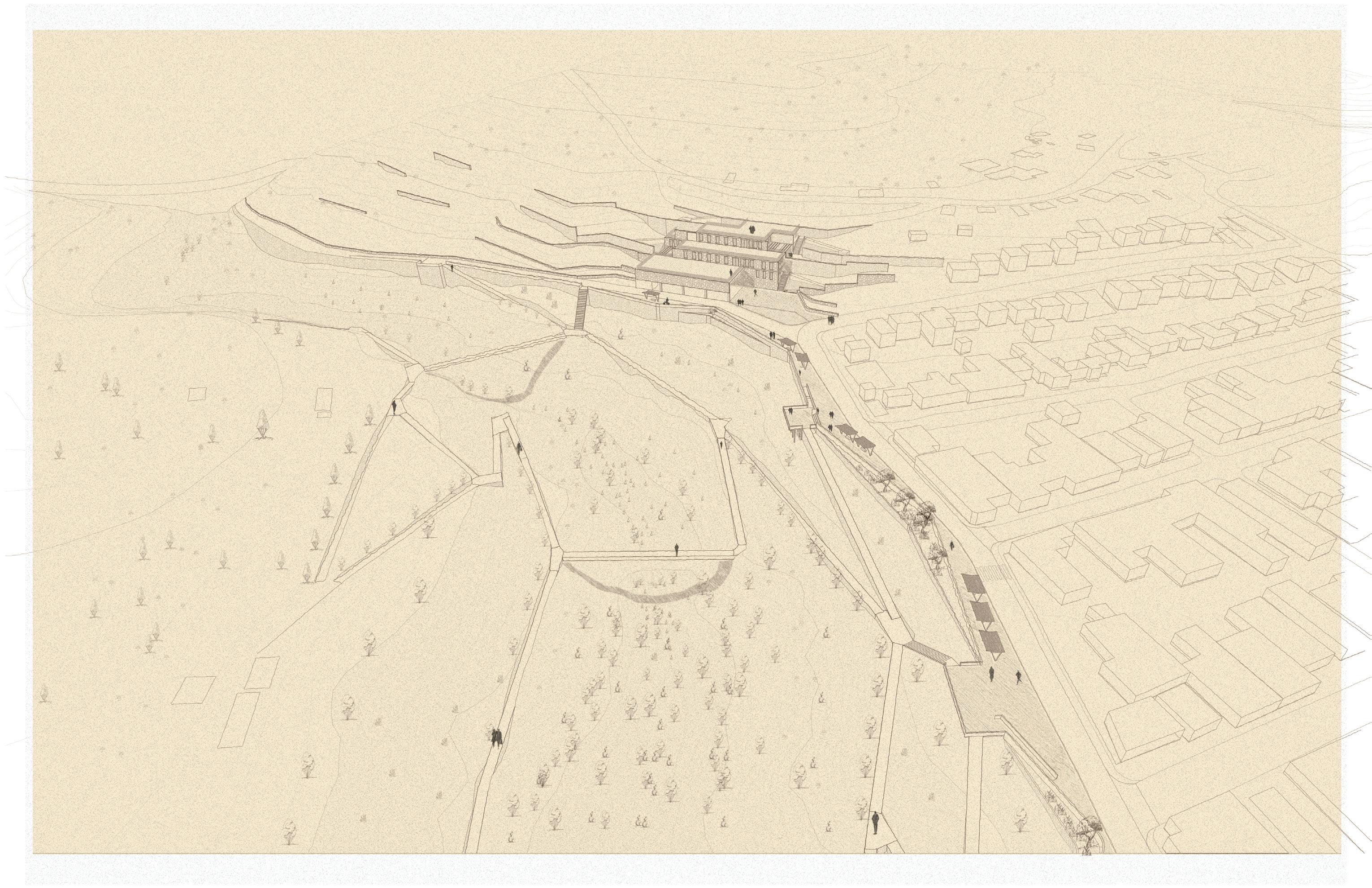 The culmination of this corridor is a children’s center placed at the edge of the existing established urban fabric, meant to serve as a further connector for those in informal settlements, while providing much needed educational and recreational infrastructure for families living in this area. This catalyst building continues with landslide mitigation by forming itself through a series of retaining walls, and creating plazas on the top of each level, helping to continue the language of the masterplan.
