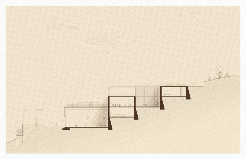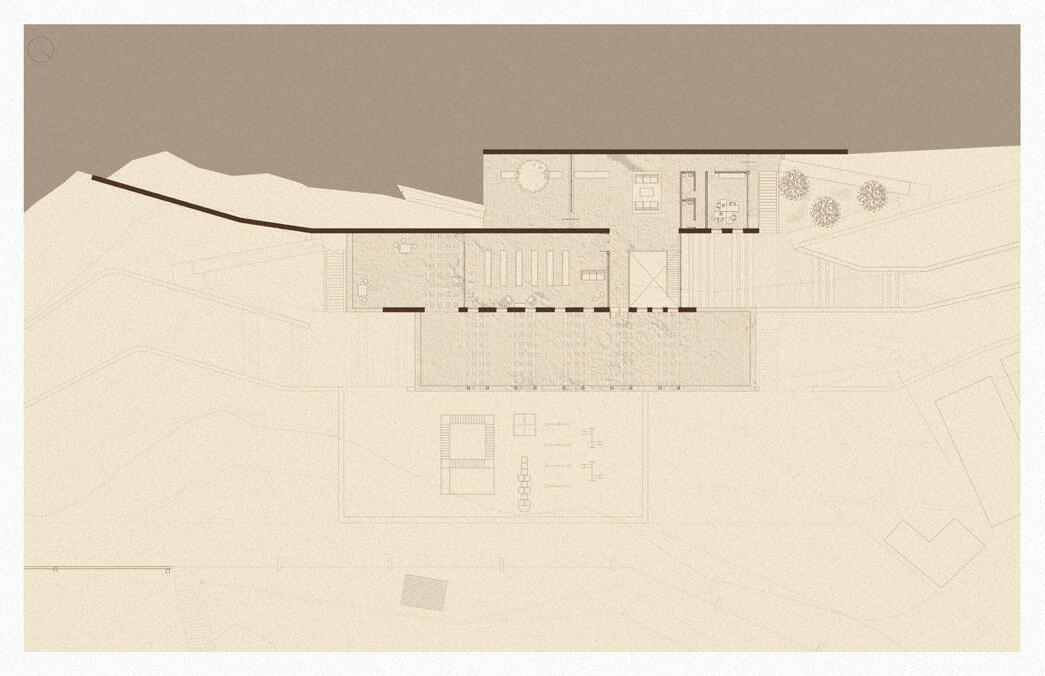 Between the two buildings, the landscape transitions, blurring the lines between what is built on top of the earth and what is carved within. The result is a series of courtyards within the larger landscape, each with differing programs and relationships to the earth and buildings on the site.