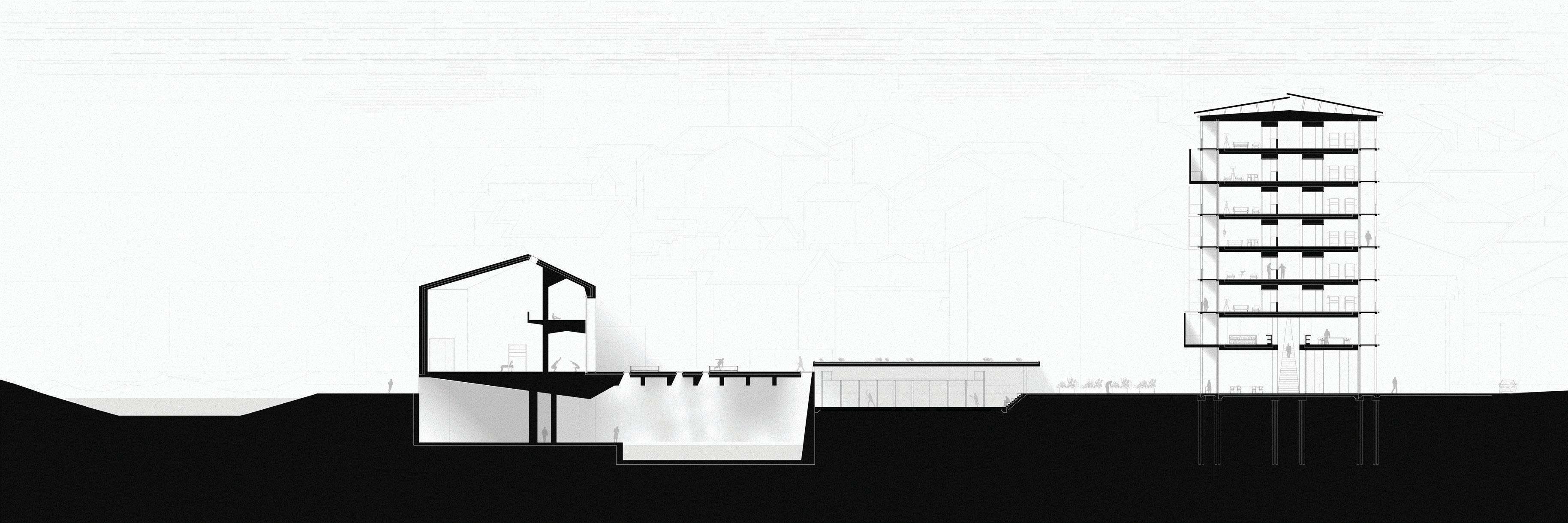 Top: Section B-B through the insitutional plaza