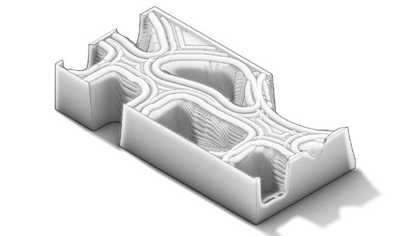 The transition of this panel from the digital world to the tangible analog world allows the fruits of these explorations in procedural logic to be seen, as the parametric shapes, patterns, and overall 3-dimensional field begin to impact qualities in the model such as transparency, perception of overall size, and even strength.