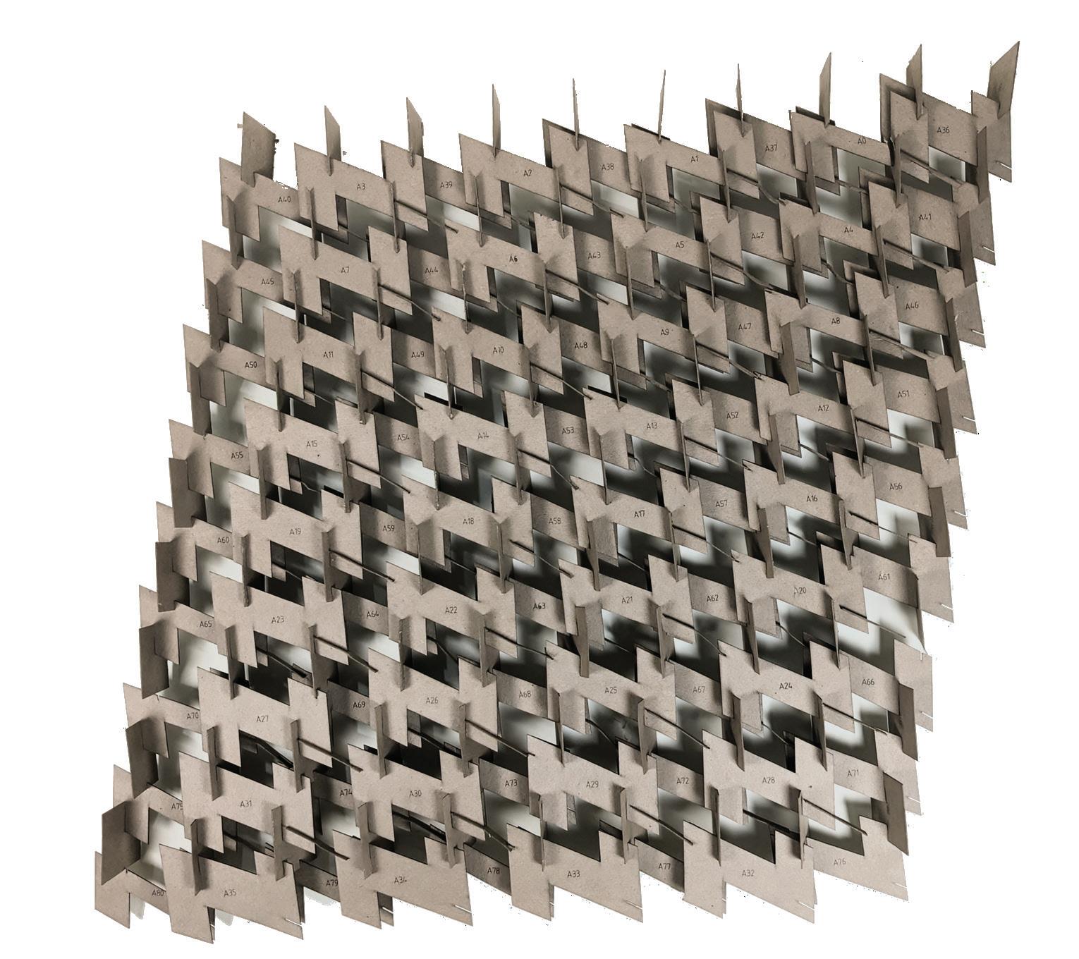This panel starts from a single lightning-bolt shape, with parametric variation occuring in one dimension of the shape, and the vertical spacing of each lightning bolt. Assembled without glue and using Grasshopper scripts and a laser cutter, this prototype shows the possibility of real-world fabrication using a procedural logic.