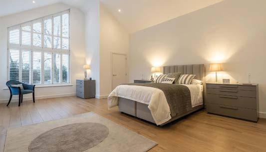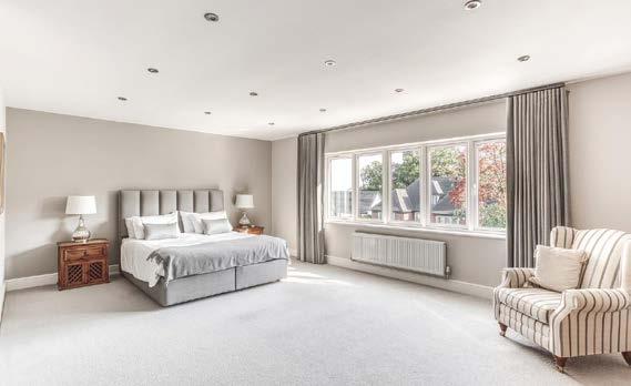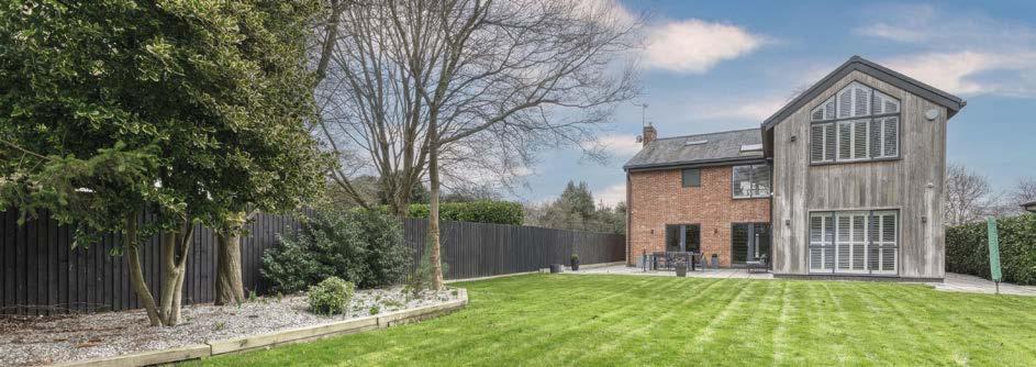 microwave with warming drawer, an induction hob with concealed extractor, integrated dishwasher, Bosch fridge and freezer, and a double stainless steel wine cooler. The kitchen is further enhanced by underfloor heating, integrated sound speakers and glazed bi-folding doors framing views of the landscaped gardens.