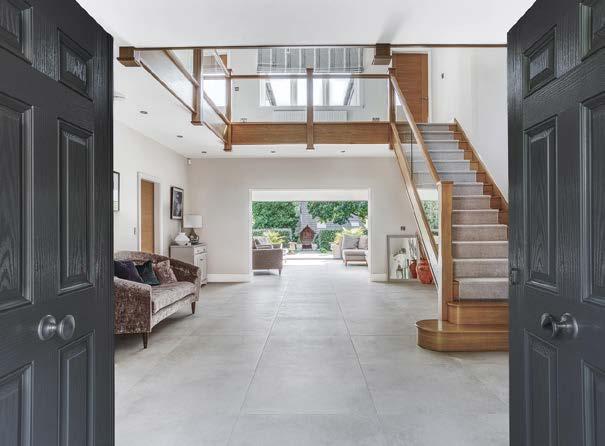The property opens with an oak front door framed by glazed side and top panels, allowing natural light to flood into the impressive reception hall. Here, tiled flooring with underfloor heating, a vaulted ceiling, and a handcrafted oak staircase with glass balustrade create a