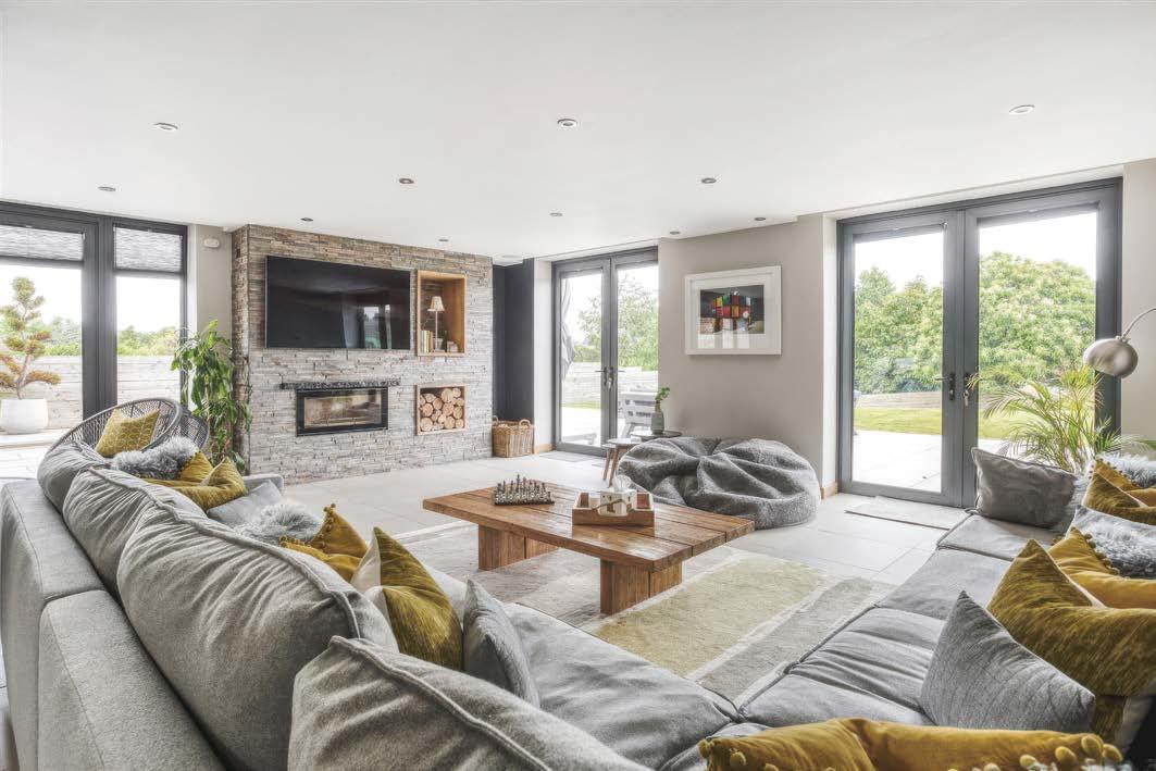 This expansive open-plan space is the social hub of the property. The snug area features a second chimney breast with patterned tiling, a log-burning stove, and dual log store alcoves. Double French doors open to sun terraces, landscaped gardens, and a large patio with a dramatic water feature, blending indoor and outdoor living effortlessly.