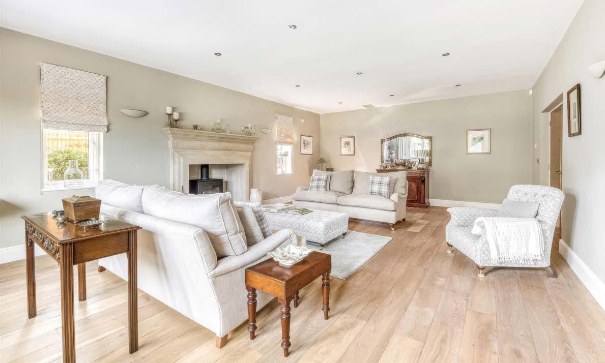 A feature chimney breast with decorative tiling houses an inset log-burning stove, complemented by bespoke illuminated display shelving and cabinetry. Underfloor heating, integrated ceiling speakers and oak finishes bring refinement, while French doors open onto a block-paved terrace and formal gardens.