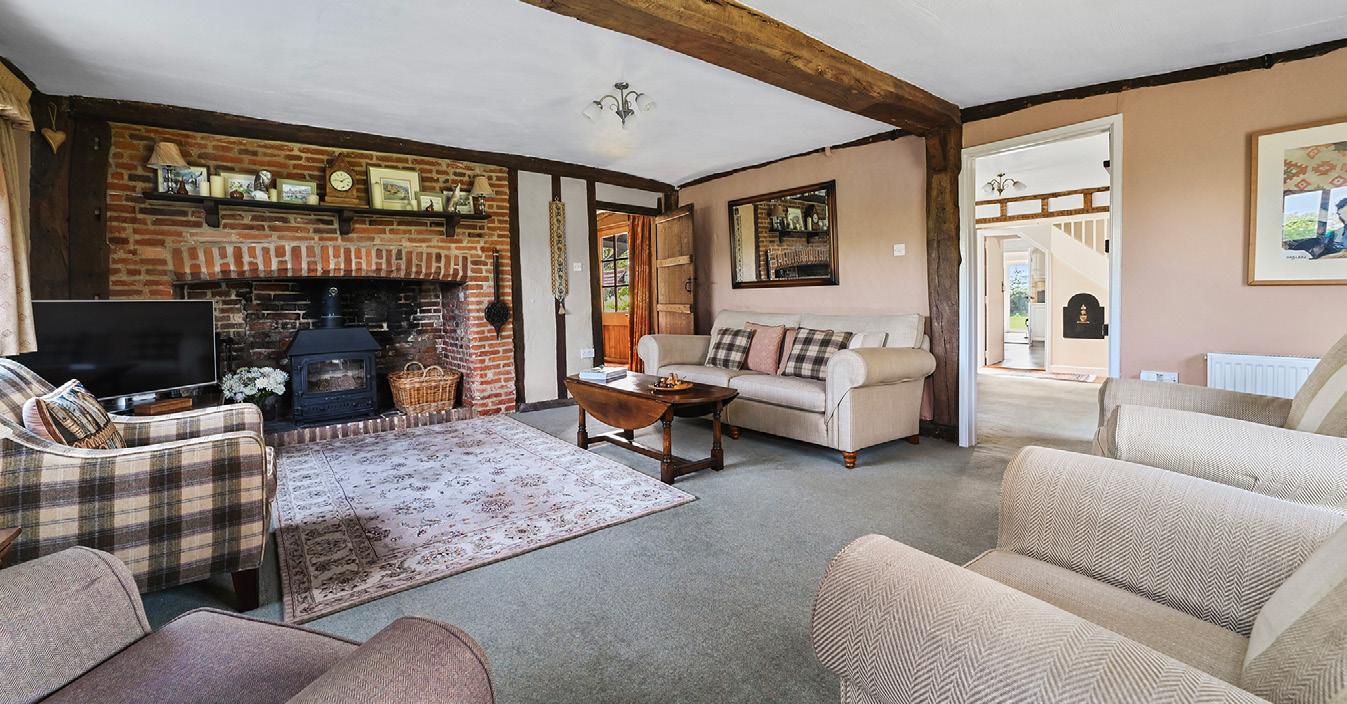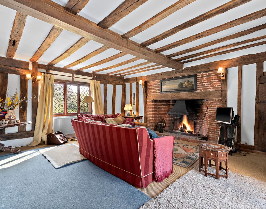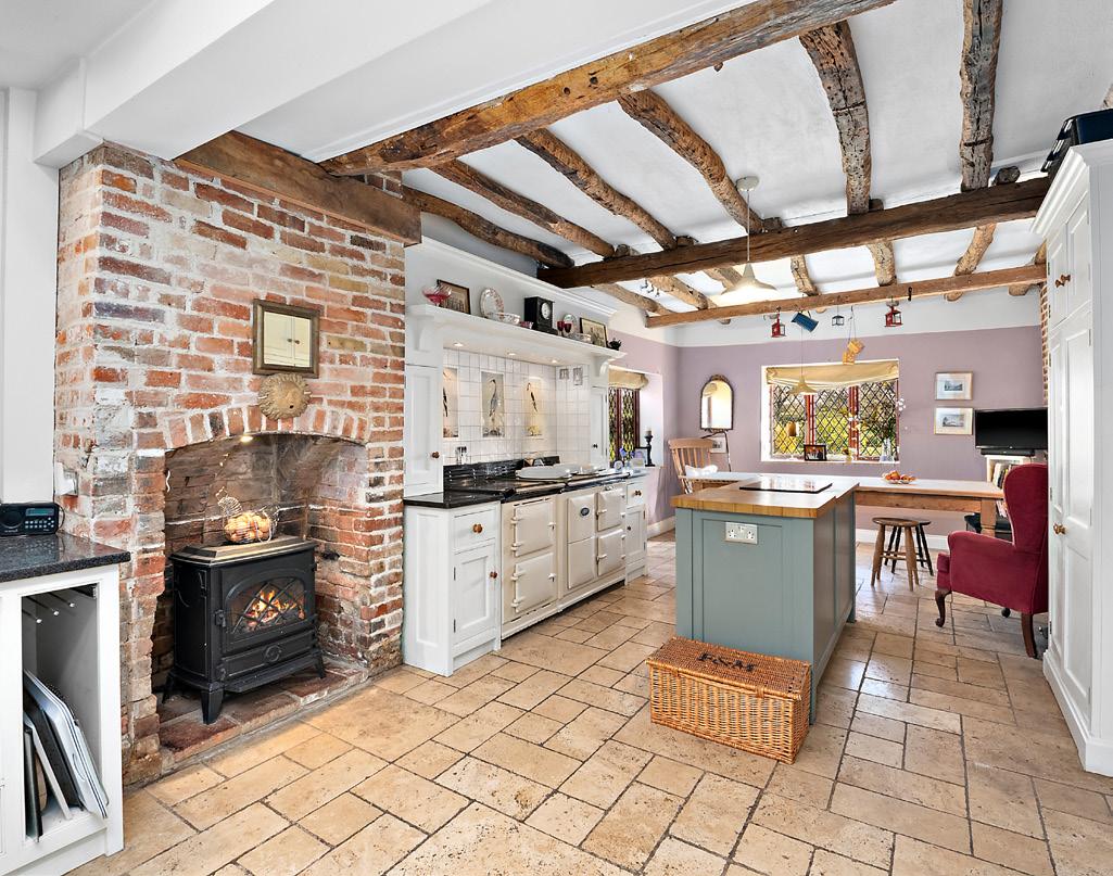 Original features include inglenook fireplaces, exposed timbers, and mullion windows. The beautifully arranged accommodation features a triple aspect drawing room, timbered sitting room, vaulted sunroom and dual aspect kitchen. Upstairs offers a triple-aspect master suite, three additional bedrooms with countryside views, and two bathrooms.