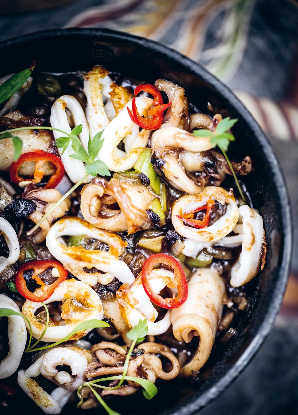 SQUID IN BLACK BEAN SAUCE WITH DEEP-FRIED SHALLOTS