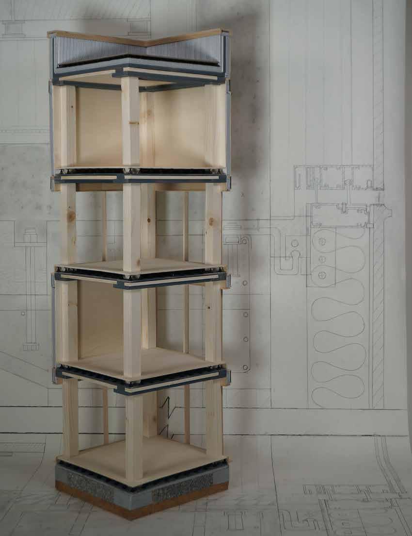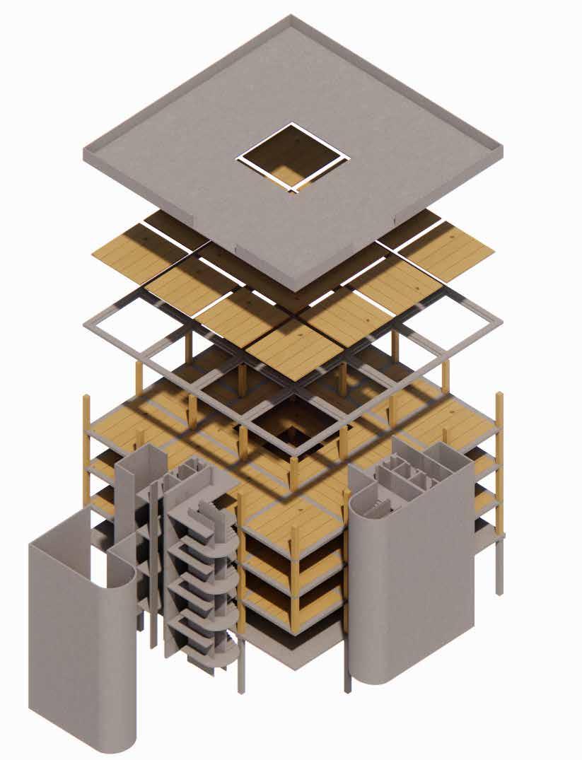 EXPLODED VIEW OF GLULAM COLUMNS, CONCRETE SPANDRELS, AND CLT FLOOR PLATES