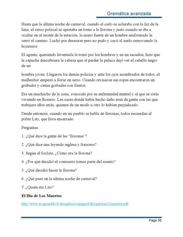 Gramática avanzada Hasta que la última noche de carnaval, cuando el cielo se aclaraba con la luz de la luna, el cerco policial se apretaba en torno a la llorona y justo cuando se iba a ocultar en el monte de la estación, la mano fuerte de un hombre uniformado le cerró el camino. Luchó por desasirse pero no pudo y cayó al suelo removiendo la hojarasca. El agente, queriendo levantarla la tomó por los hombros y en un sacudón, hizo que la capucha descubriera la cabeza que al perder la peluca dejó ver el cabello negro de un hombre joven. Llegaron los demás policías y ante los ojos asombrados de todos, el malhechor empezó a llorar en serio. Cuando revisaron sus ropas encontraron un grabador y cintas grabadas con llantos. Era un muchacho de la zona, conocido por su enfermedad mental y al que se creía viviendo en Rosario. Las casas donde había hecho daño eran de gente con las que trabajara años atrás, quienes de un modo u otro lo habían perjudicado. Desde entonces, cuando en mi pueblo se habla de lloronas, todos recuerdan al pobre Lito, que llora encerrado. Preguntas 1. ¿Qué dice la gente de las “lloronas’? 2. ¿Qué dice una leyenda inglesa y francesa? 3. Según el foclore, ¿Cómo era la llorona? 4. ¿Por qué decidió el comisario tomar parte del asunto? 5. ¿Qué decidió hacer la llorona? 6. ¿Qué pasó en la última noche de carnaval? 7. ¿Quién era Lito? El Dia de Los Muertos http://www.ac-grenoble.fr/disciplines/espagnol/file/paloma/11muertos.pdf