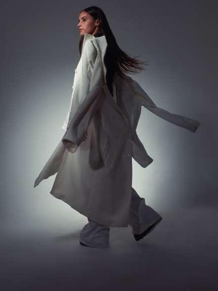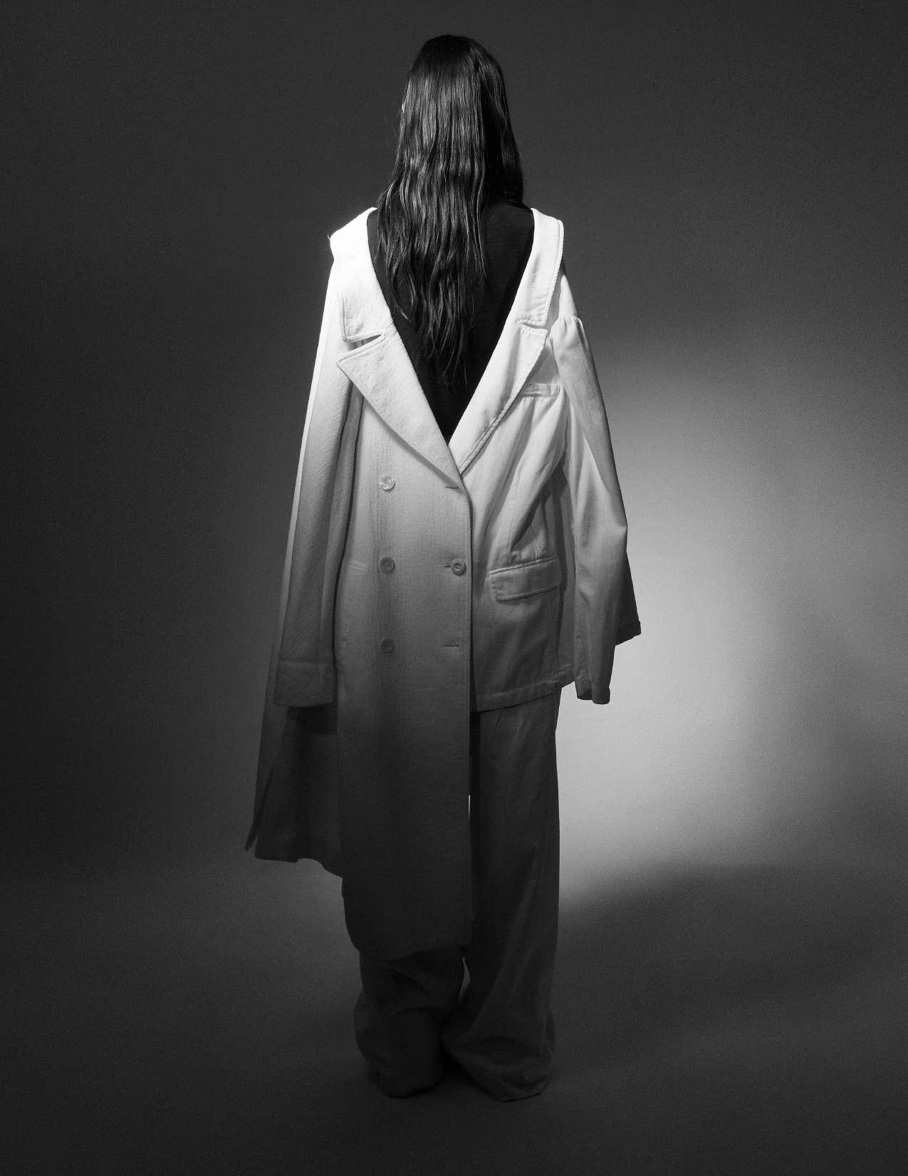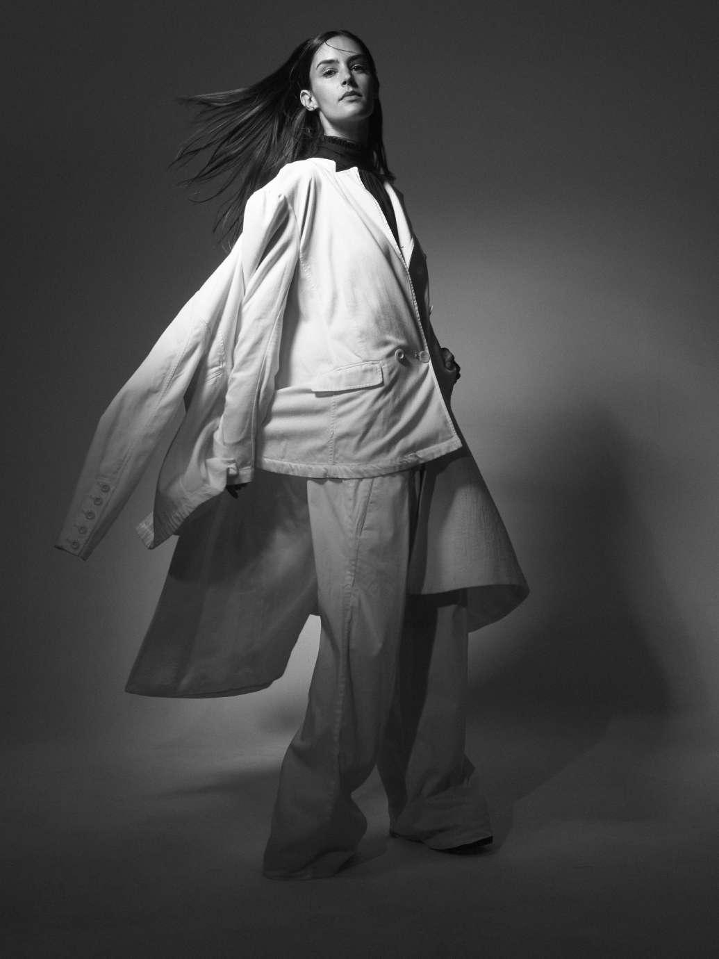 En esta producción se va observar un juego de superposición, fusión de prendas e invertir la manera de acceso del clásico saco. como principal objetivo decidimos transmitir una mujer empoderada ,fuerte y autoritaria, a si mismo, la simpleza y la delicadeza. Además se busco evidenciar que la sastrería no es solo para hombres. Es por esto que elegimos una modelo mujer que represente el concepto que planteamos. El encargado de la fotografía en esta producción de fotos, fue Ariel Bocco. Se busco transmitir a través de las imágenes blanco y negro una modelo con poder, fuerza, misterio, autoridad y elegancia. Por otro lado, en los años 80’ las fotografías blanco y negro se consideraban mas artísticas. El estilismo elegido, es simple dándole importancia a la luz del rostro de la modelo quien fue GretaBonasso.