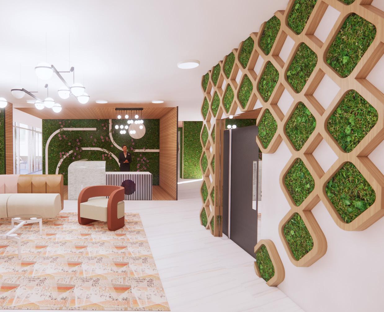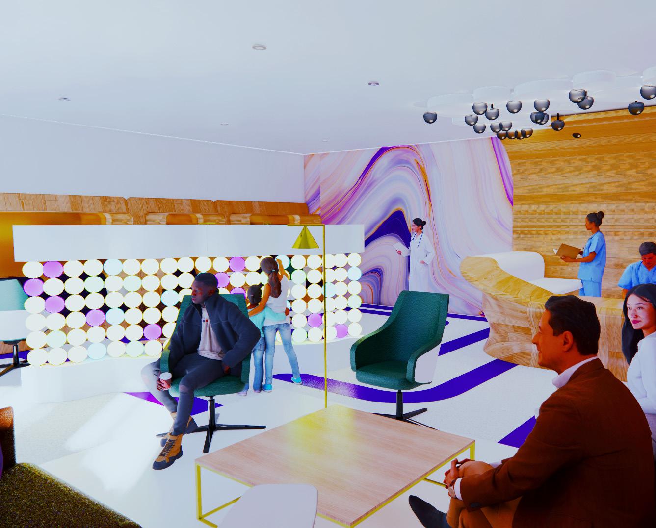 The abstract, soft design of the wallpaper in the waiting room creates visual stimulation that calms visitors with purple toned grooves.