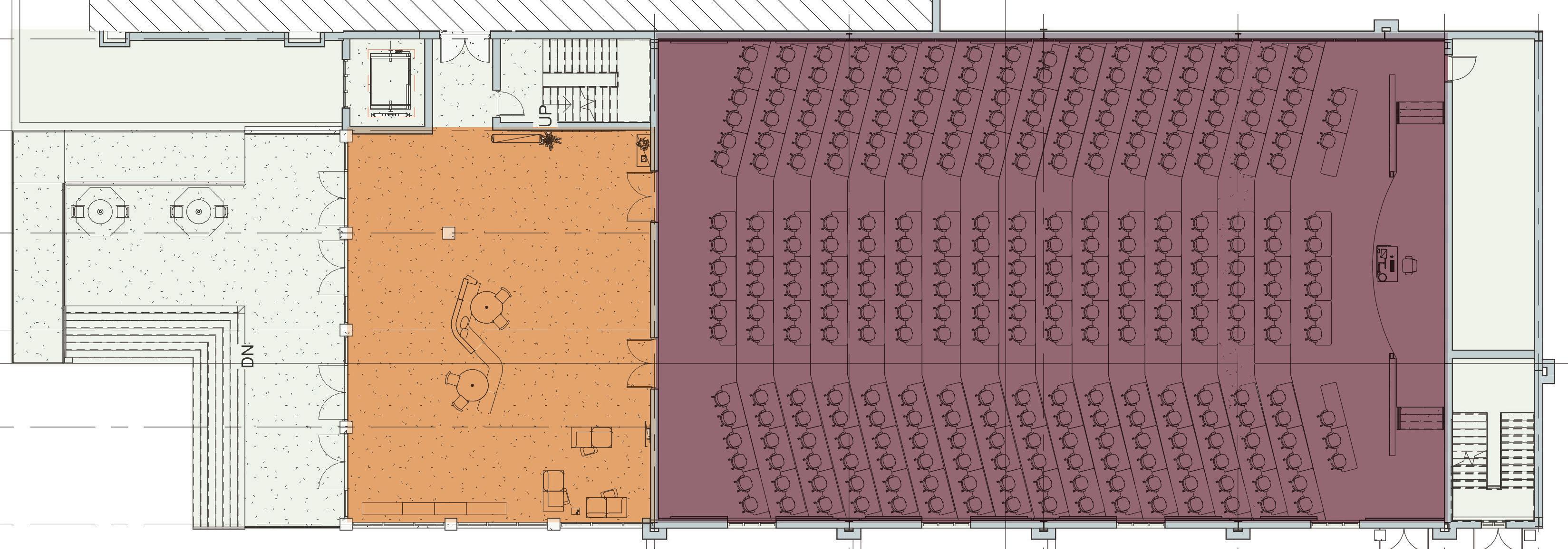 Hand Lab’s current auditorium interior design consists of minimal material selection. Painted brick walls, blue seating & a fairly old projection screen are design elements that may need changing. The existing space only has one ADA accessible entrance at the top of the auditorium, another design flaw observed. The space currently holds 64, so expansions are needed to fit 300.