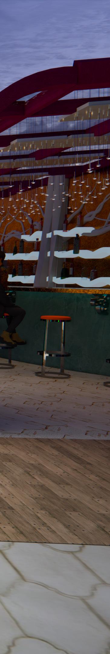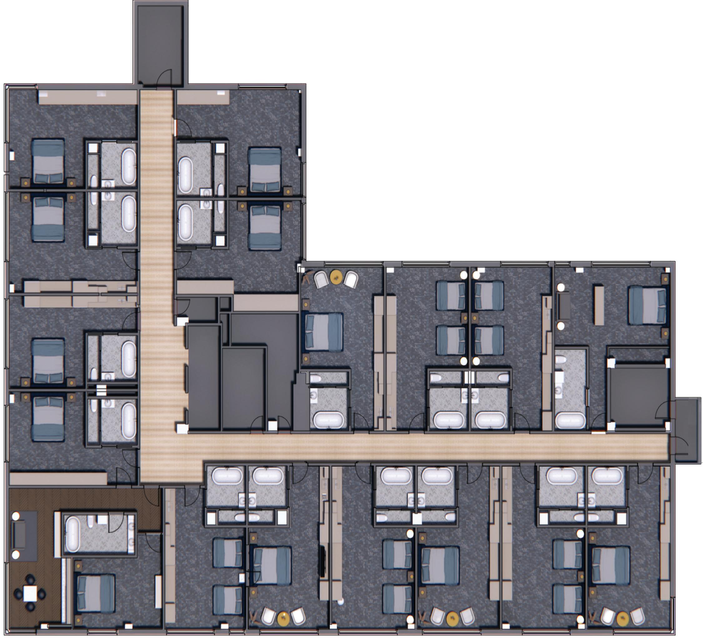 Students in groups of 4 were tasked with designing a 4-star boutique hotel in the location of their choosing. The building is located in New Orleans, LA & is 18 stories high, featuring a lobby floor, 8 guest room floors, 7 apartment floors, & a rooftop bar & restaurant. The group’s collaborative approach was to assign each team member to a different area of the hotel; the team worked together to ensure that each space had it’s own unique identity while also remaining consistent with the overall design of the hotel.