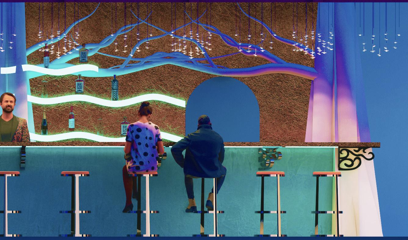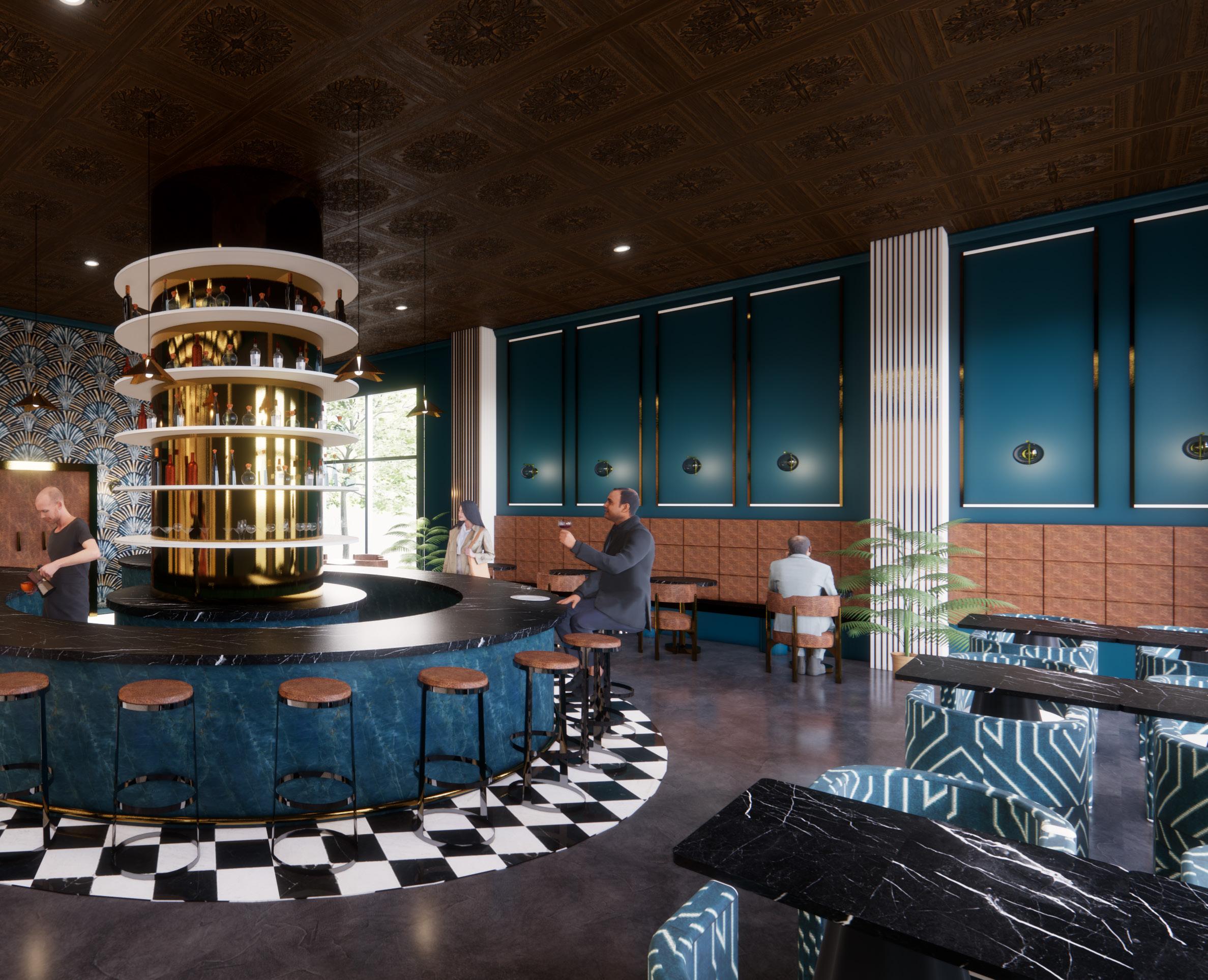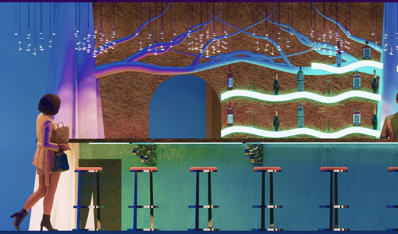 Dark colors in the bar contrast highly lounge to draw guests in. Neon lights juxtapose the duller tones in the bar, the bar.