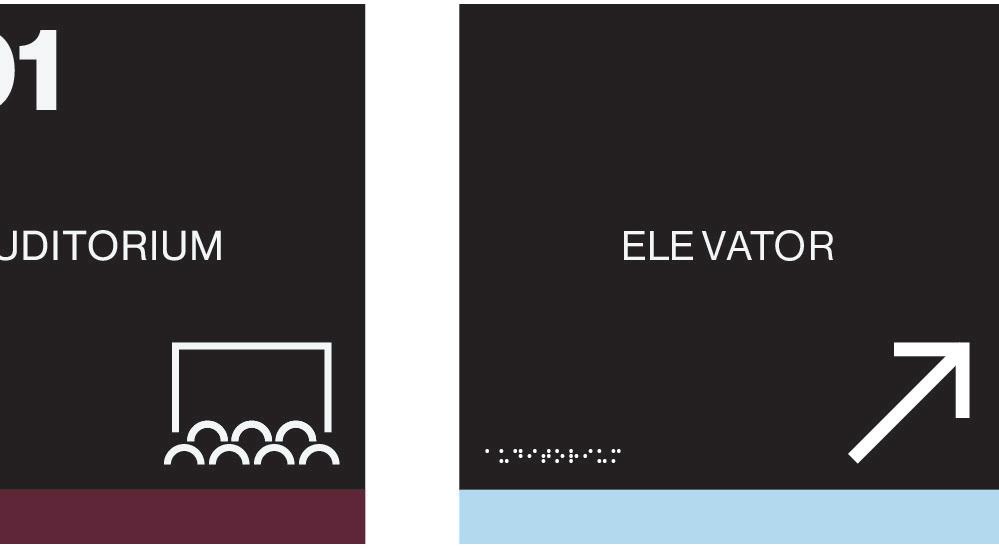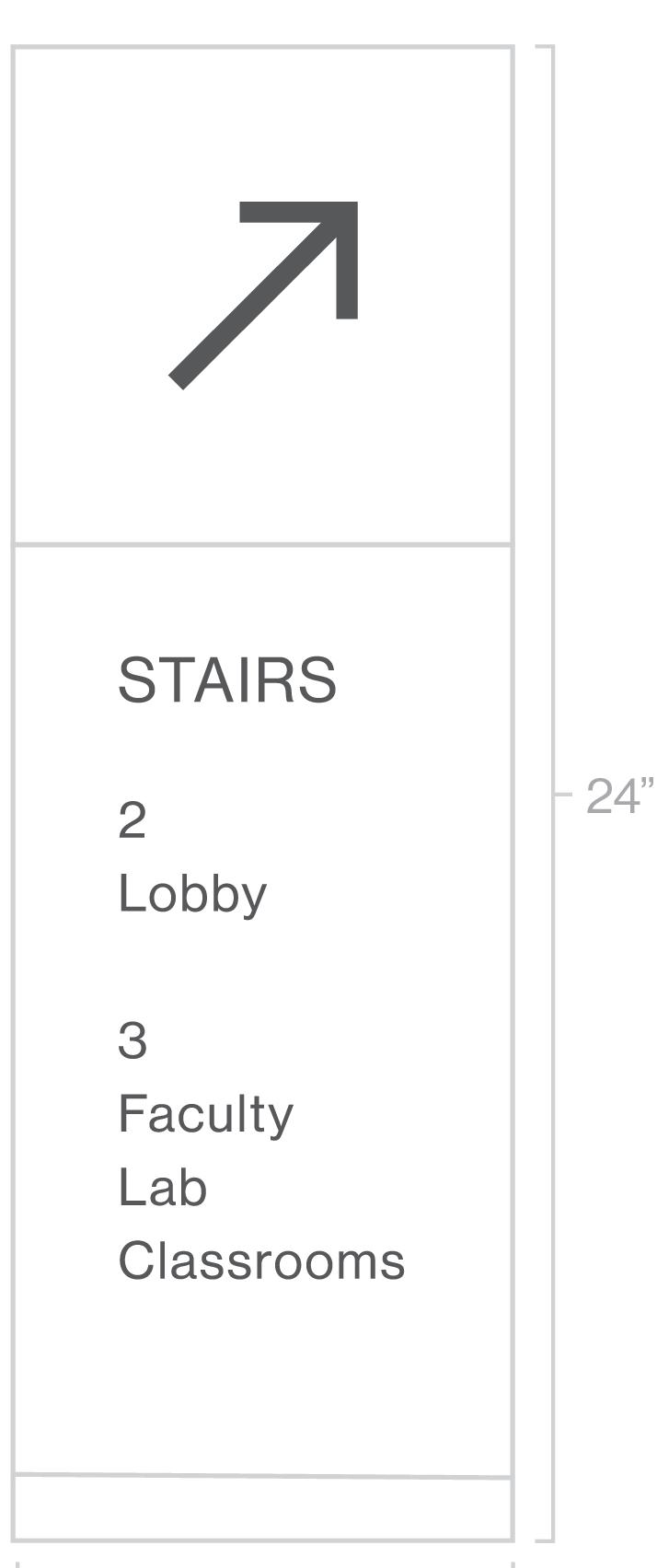 All spaces have unique signage. Offices have 2 signs for easy swapping of name and title if necessary. Classrooms, labs, restrooms, & auditoriums utilize permanent, square signs. Stairs have signs that are talle r than the rest, allowing them to list areas on floors above or below.