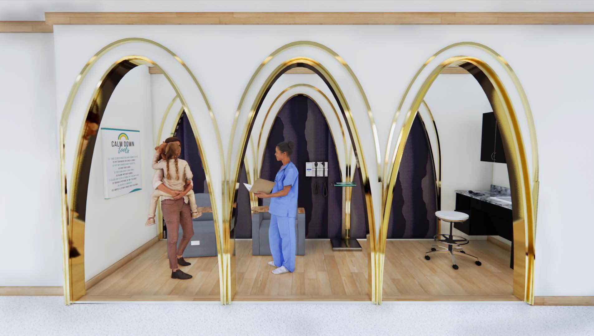 Design intent for the behavioral clinic is inspired by the movie Inside Out. Inside Out dives into the complex emotions of a young girl, Riley. Joy, Sadness, Fear, Anger, & Disgust, are animated characters that occupy Riley’s brain & help her navigate the world. The movie teaches children about emotional intelligence, a necessary tool when managing emotional ups and downs. examples by staff. Colors and shapes found in the film’s animations can be seen in design elements, which are repeated throughout the space to create a fun & welcoming environment that encourages emotional availability.