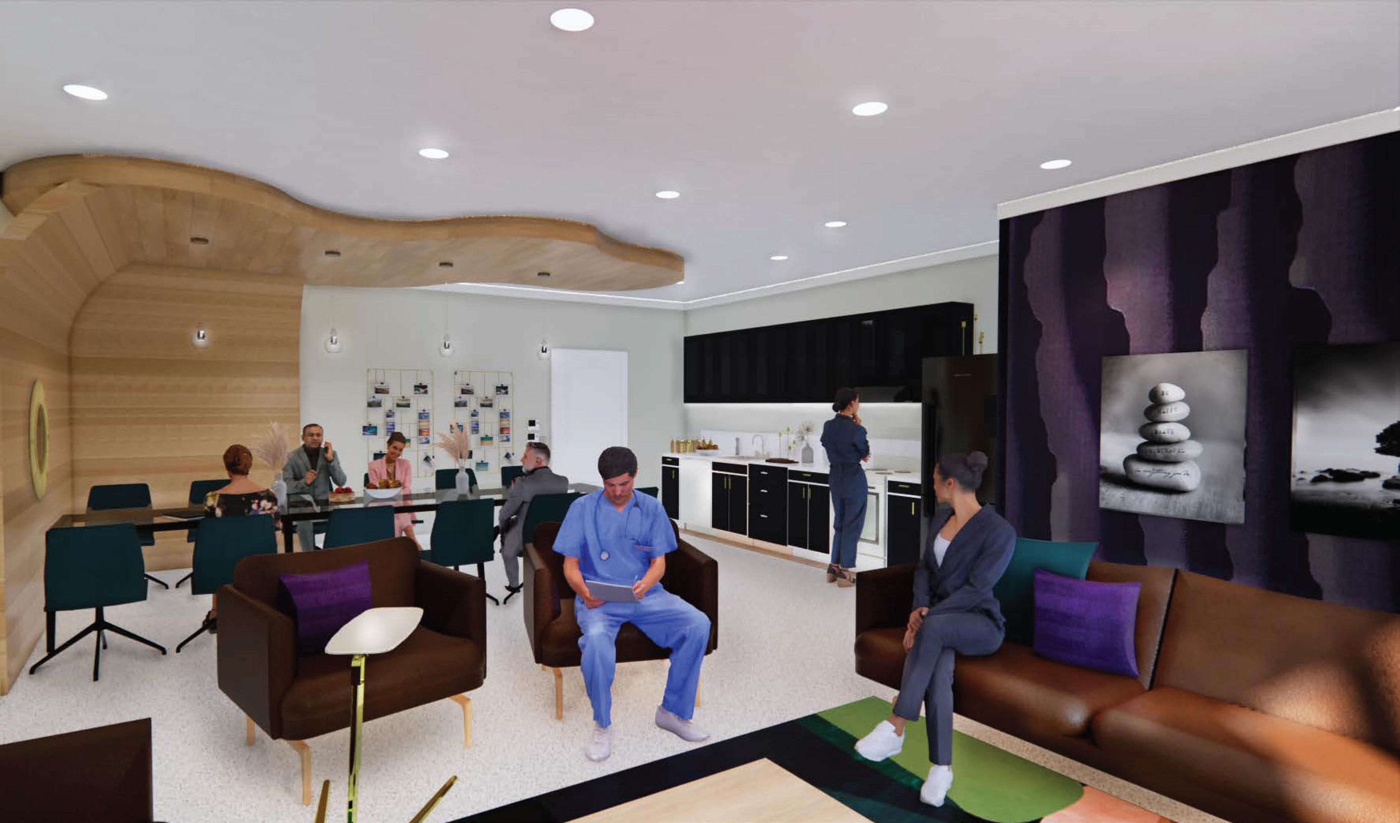 Within the last year alone, employee burnout within behavioral health fields have gone up 40% due to the many additional stressors from working in the pandemic. The staff lounge utilizes muted finishes, lounge-style furniture, & natural wood textures to create a more relaxing environment for staff to recharge at any moment during their busy day.