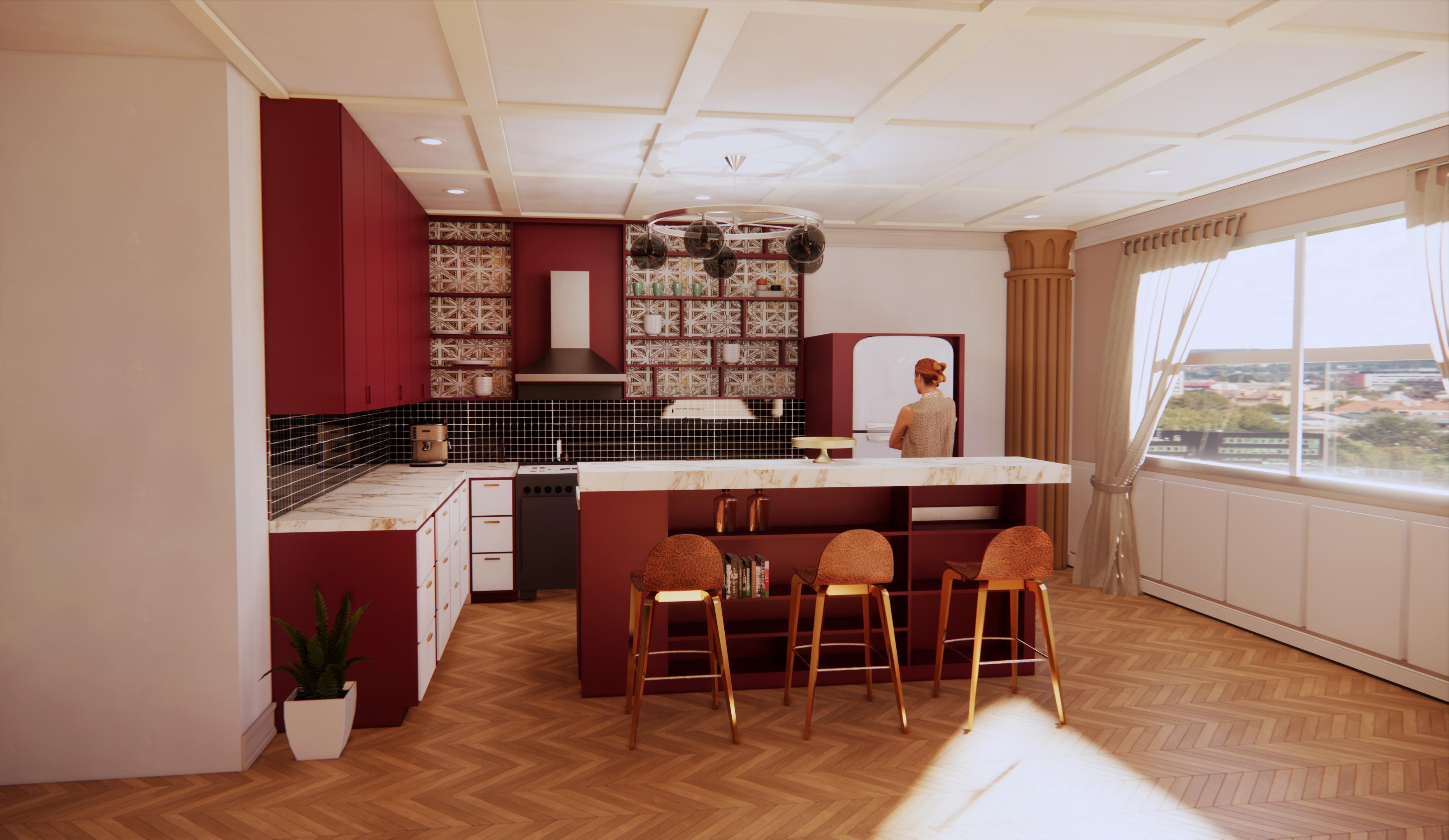 Gothic tracery is used as a backsplash in the kitchen. The lamp above the island is a direct nod to the chandeliers in St. Louis Cathedral. These Gothic additions are paired with art deco furniture to create an apartment layout that is both classic & modern.