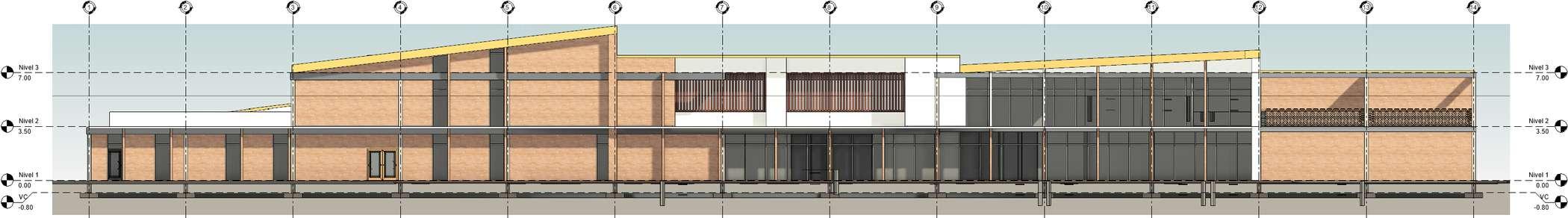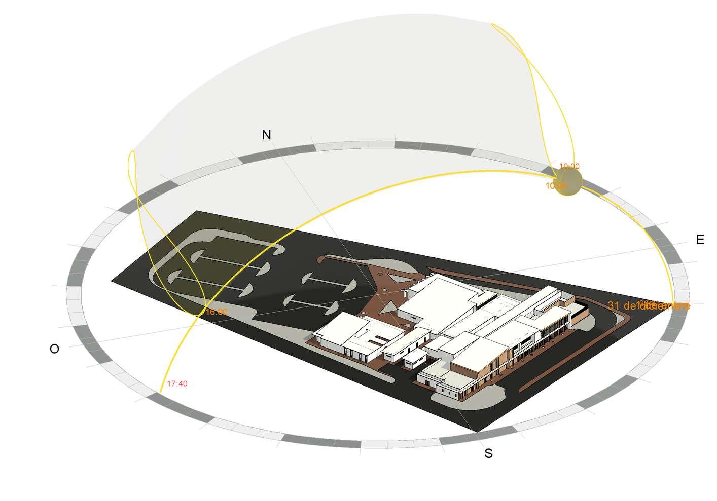 COMO PROTECCIÓN SOLAR SE IMPLEMENTAN PARTE LUCES EN LA FACHADA ESTE Y OESTE DE UN ANCHO DE 0 5 M Y CUBIERTAS EN VOLADIZO SE DISEÑA DE MANERA HORIZONTAL PARA TENER UNA VENTILACIÓN CRUZADA Y TAMBIEN SE IMPLEMENTARON CUBIERTAS ELEVADAS PARA TENER VENTILACIÓN CENITAL MANTENIENDO ASI EL CONFORT TERMICO EN EL INTERIOR