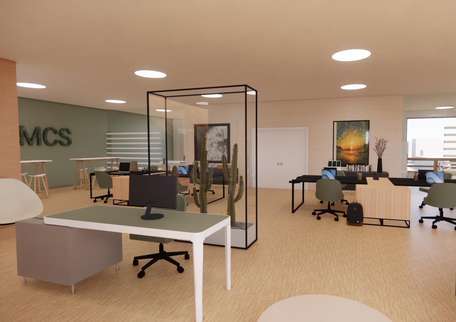The second floor continues the linear organization from the first floor. The adjacent open space looks out over the lobby and cafe. The open views make the waiting area feel more open. The offices and break room will continue with the vertical columns and windows.
