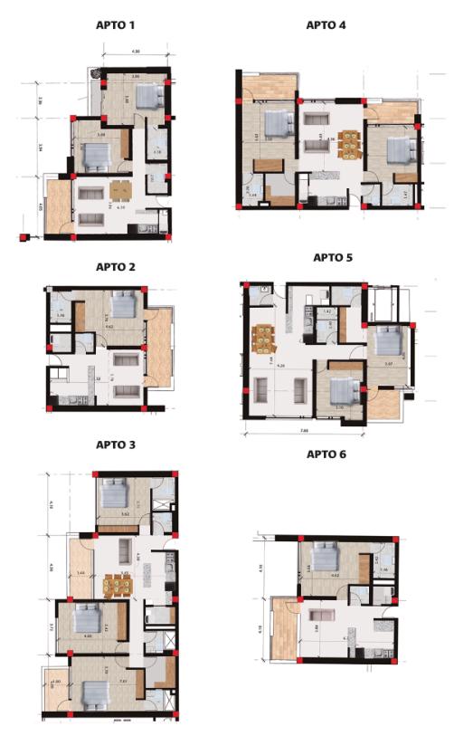 Tipos de Vivienda: Se plantean 6 tipos de vivienda con pasillo central, las tipologías se clasifican así: vivienda tipo 1: 1 dormitorio, vivienda tipo 2: 2 dormitorios, vivienda tipo 3: 3 dormitorios