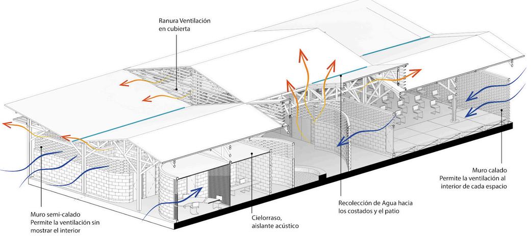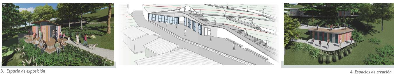 Con la implantación del proyecto, se busca crear un espacio de integración- recibimiento a la comunidad, así pues el primer edificio de recepción se anticipa con una plaza, donde el público puede encontrar puntos de información para empezar un recorrido a diferentes niveles de altura, que a su vez muestran gran parte de lo que conforma la comunidad Pasto entorno a sus pensamientos y formas de vida.