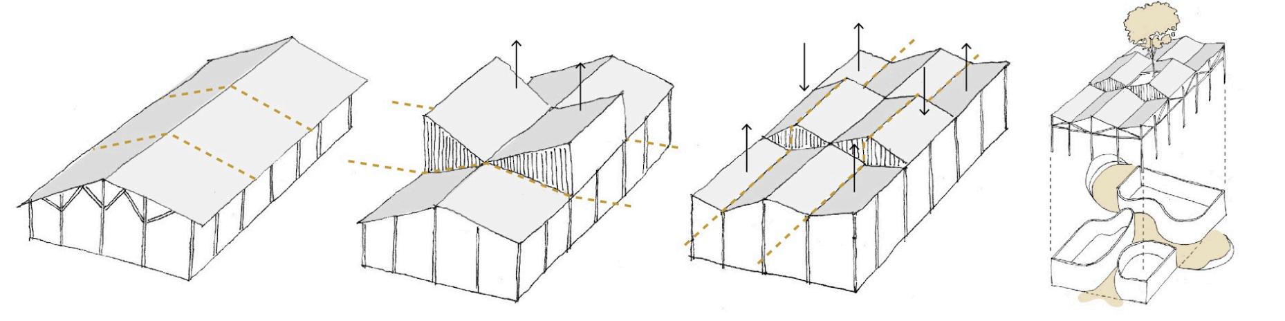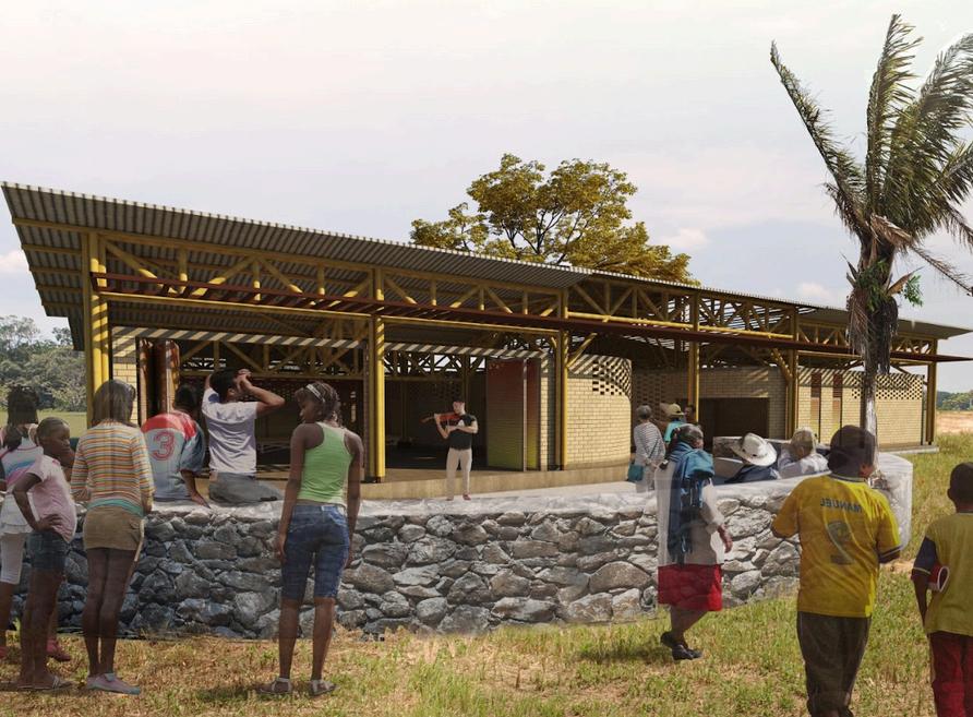 El diseño simple y rudimentario con una sola curvatura de la herramienta indígena amazónica inspira la composición de la Casa Multicultural El Arco desde la esencia transformadora de la arquitectura para la paz. La innovación en el uso de materiales naturales retoma las tradiciones constructivas de los. indígenas Nukak, Jiw y los muchos campesinos colonos que habitan el Guaviare para satisfacer las condiciones bioclimáticas y de confort requeridas en un espacio comunitario dispuesto para el > aprendizaje y la presentación artística, musical y teatral.