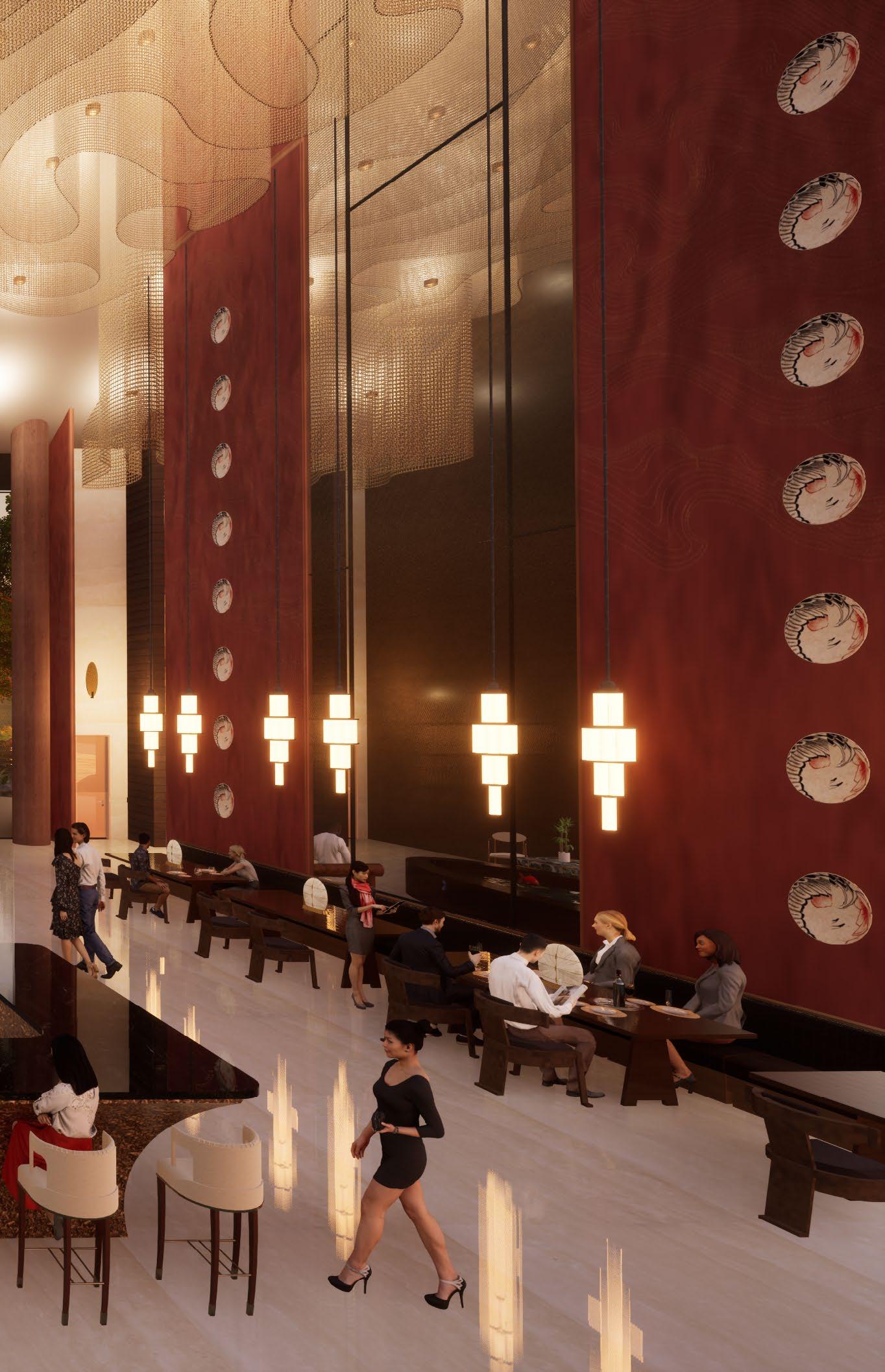 past and present. The color palette and textures draw inspiration from the natural beauty of Yamansh. Bringing the surrounding landscape indoors creates a sense of harmony and flow. Every aspect of Ukiyo, from its branding to its architectural features is unified in elegance. The indoor koi pond and outdoor zen garden serve as focal points and give emphasis. The unique ceiling details that follow throughout the entire restaurant create rhythm and flow. Lastly, the design of Ukiyo incorporates many interior elements to combat the tall ceilings and make them feel more proportional to the small furniture. Overall, Ukiyo’s design reflects a deep appreciation for Japanese culture and aesthetics.