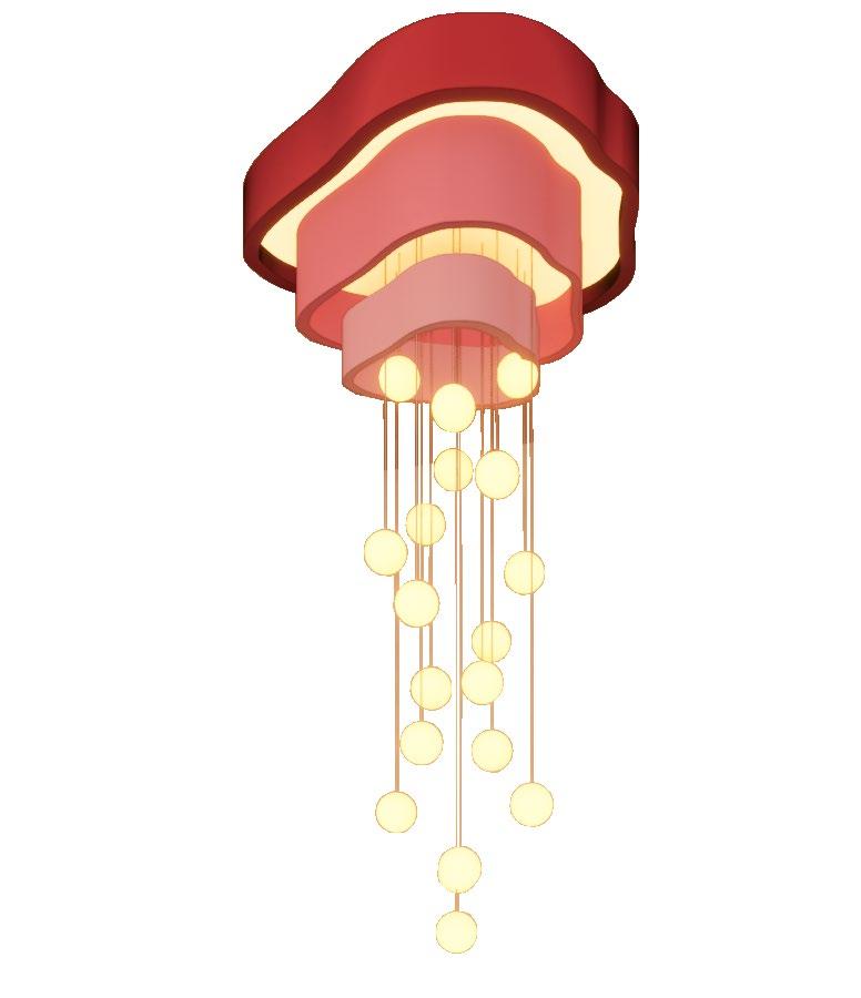 This pattern, which is based on slices of fruit, began as a wallcovering idea for the space. These rings translated into 3D, tangible elements and eventually became featured on the ceiling where the chandeliers hang from. This design element truly factors the theme into every detail and creates visual interest all the way up to the ceiling.