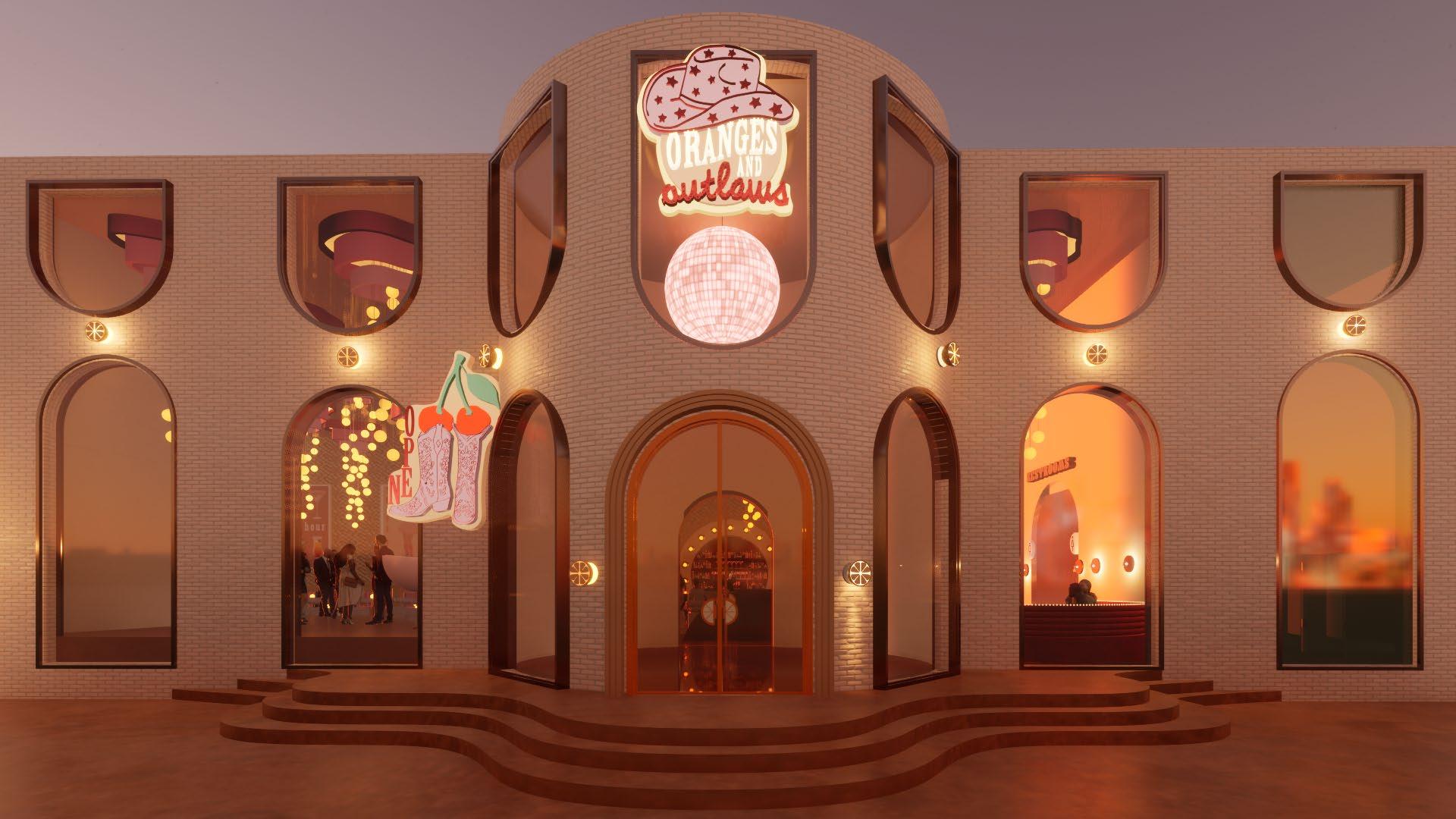Orange and Outlaws invites guests in from the outside by showcasing the nightlife inside with large windows. A disco ball and a grand door with orange slice handles entice passersby.