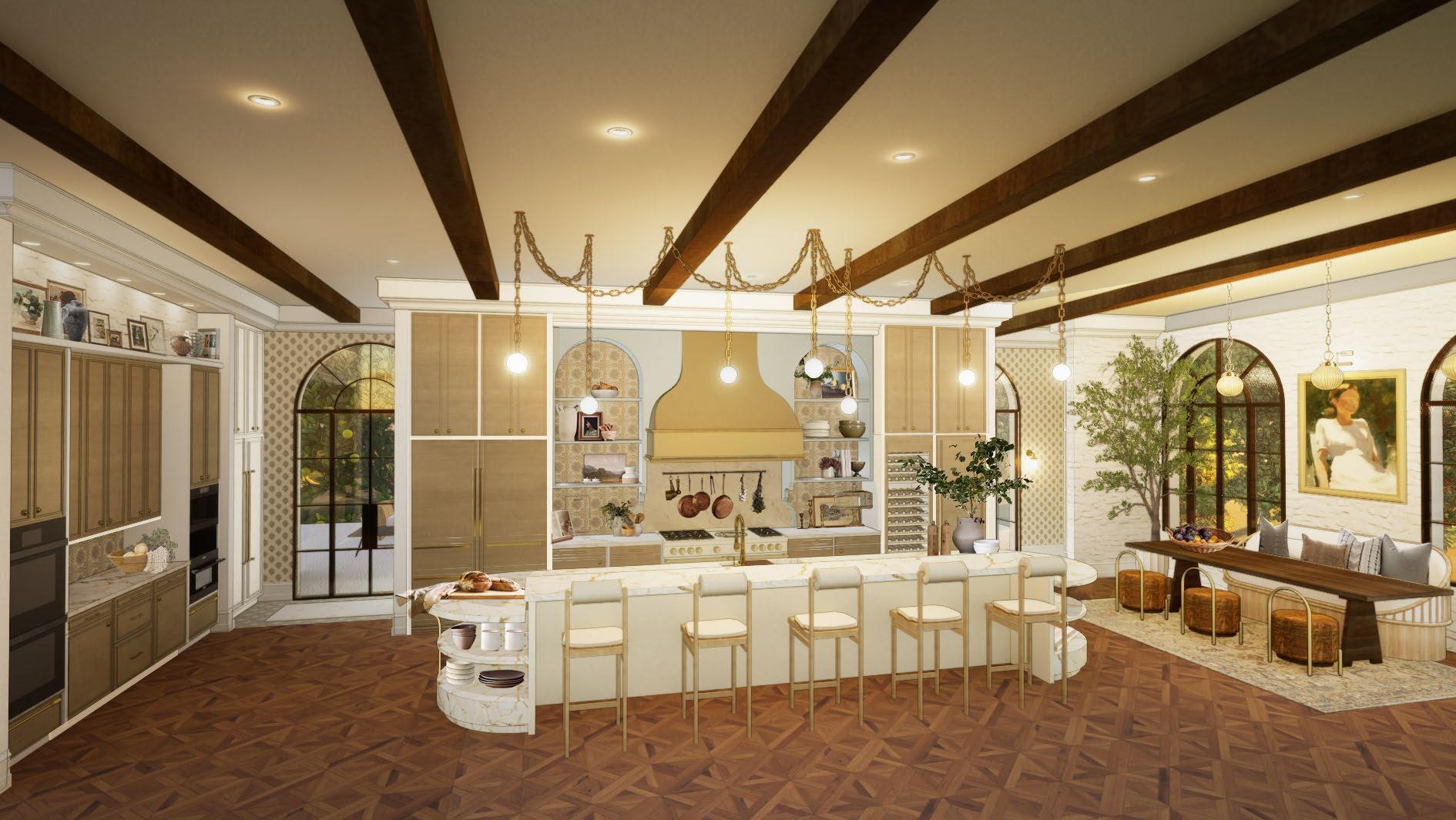 The kitchen layout is designed with functionality and socialization in mind. Featured is a floorplan that easily connects the adjoining areas and a large central island that serves as a focal point. The design provides ample space for food preparation, casual dining, and gatherings.