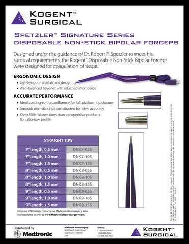 Kogent™ Surgical Spetzler™ Signature Series disposable non-stick bipolar forceps Designed under the guidance of Dr. Robert F. Spetzler to meet his surgical requirements, the Kogent™ Disposable Non-Stick Bipolar Forceps were designed for coagulation of tissue. ERGONOMIC DESIGN ■ Lightweight materials and design ■ Well-balanced bayonet with attached short cords