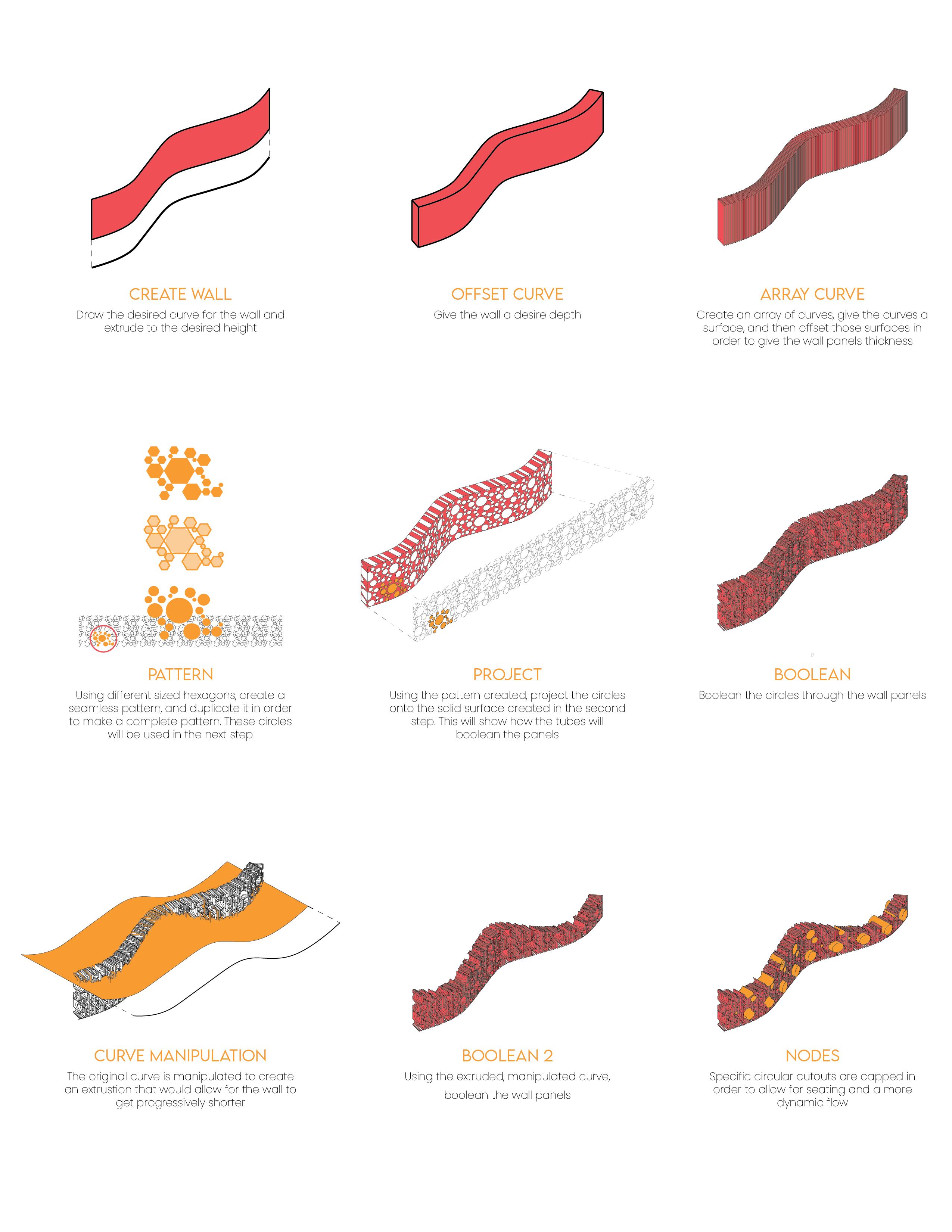 A new wall is being proposed in order to facilitate movement, diffuse noise, and create a separation of spaces to the left of the main entrance to the Murphy building. The Murphy building has been analyzed to find the ideal location for said wall. The Wall is inspired by a repeating circular pattern from the module of the Fly’s Eye Dome. The Wall is permeable so that users may see through and still feel connected upon entrance to the building. It also can allow light to permeate throughout the building. Specific circles within the pattern have been chosen to be tubes so that users may glance directly through The Wall and also in some instances, be a seat for reflection, rest, and creative space. As users begin at the entrance, they will also notice The Wall getting progressively shorter so that it creates an easy transition of spaces at the end.