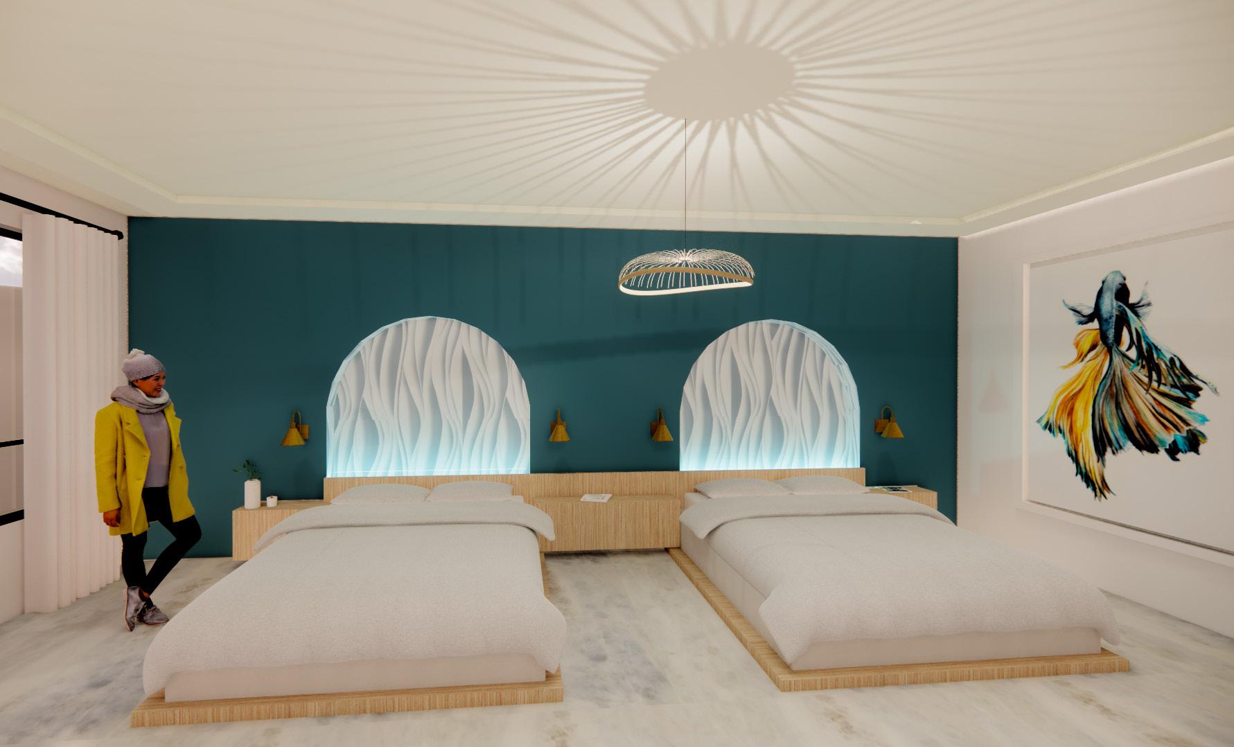 The prompt of this project was to showcase our designs for a theoretical urban and biophillic hotel located in Bangkok, Thailand. Presented are floor plans created on AutoCad and renderings completed in Sketchup. For this four story building, I used sustainable commercial grade companies to ensure that biophillia was incorporated even in an indirect manor. The concept of this hotel is the “Siamese Fighting Fish” also known as “Plakat” in the Thai language. The forms and colors of the fish were taken into consideration when making every design choice for the hotel.