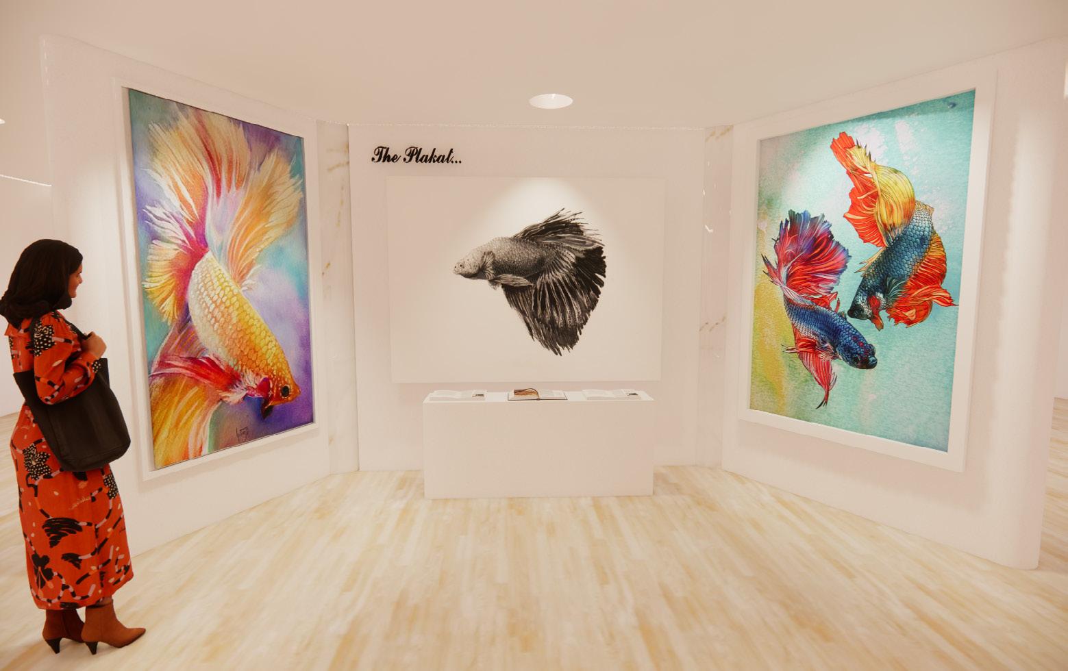 For the prompt of this project, the Plakat Hotel needed to have an interactive guest space relating back to our chosen concept. I chose an art gallery, as this showcases the choices behind each design, while also adding a sense of history and importance of the Siamese Fighting Fish in the Thai culture. Each painting and material in the art gallery is sourced locally from painters and vendors. Lighting is very important in art galleries, so to enhance that, I went into enscape and added wall grazed lighting.
