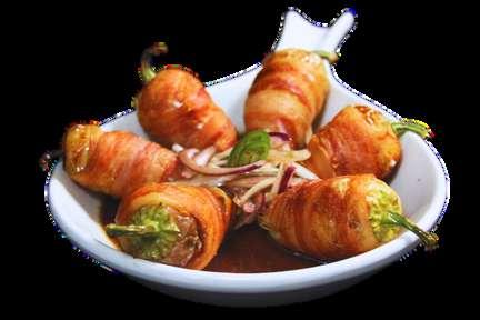 Chiles rellenos con camarón, envueltos en tocino, servidos en una sabrosa salsa mezclada con cebolla. Agrega queso Philadelphia por $1.99.