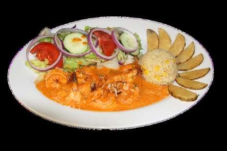 Camarones bañados en nuestra salsa a la diabla picante .Opcional puré de papa