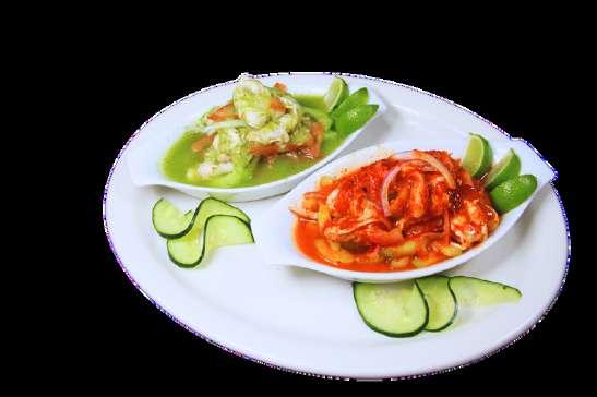 Camarón cocido en jugo de limón bañado en salsa roja o verde, camarón, pepino, cebolla, tomate sazonados con jugo de limón y nuestra salta picante roja de la casa. Agrega aguacate por $2.50. Aguachile Divorciados $4 Extra.