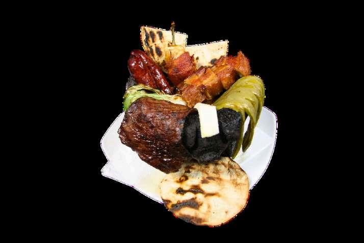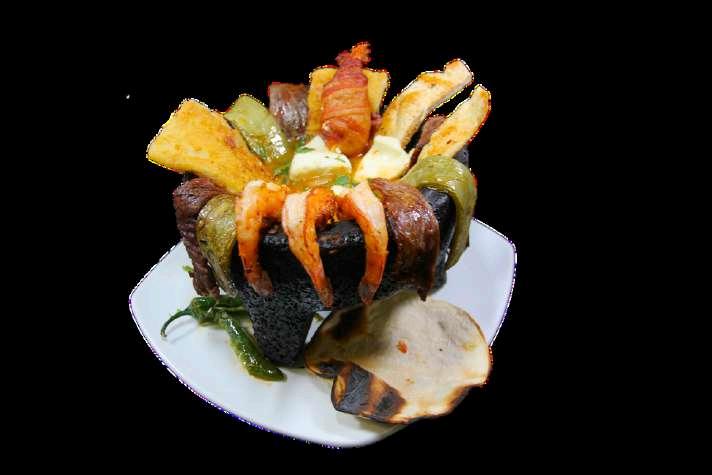 Servido con filete de arrachera, chorizo, chicharrón, quesadilla de maíz, nopal asado, Side de Frijoles ,1 tortilla tatemada en nuestra salsa de molcajete caliente con 1 torito