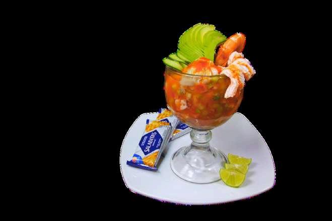 Camarón cocido, pepino, cebolla, tomate, sazonados con jugo de limón, sal y pimienta. Agrega aguacate por $2.50.
