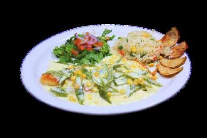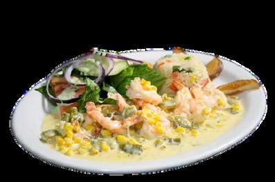 Camarones al estilo campestre en una cremosa salsa con chile verde tatemado, elote y queso gratinado. Opcional puré de papa.