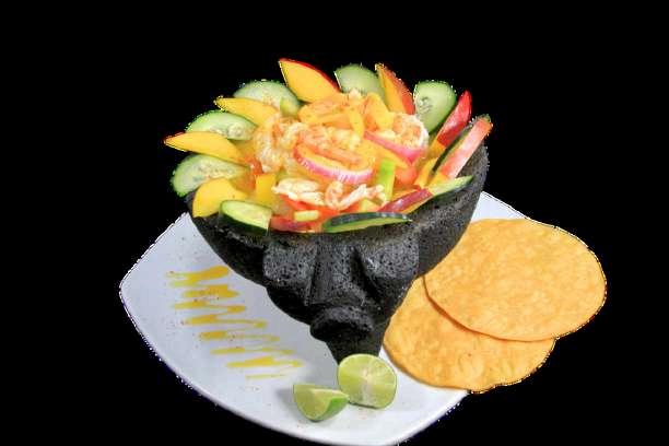 Camarón cocido, filete tilapia, aguachile, pepino, tomate, cebolla y mango fresco. Bañado en salsa de mango picosita. Agrega Aguacate por $2.50.