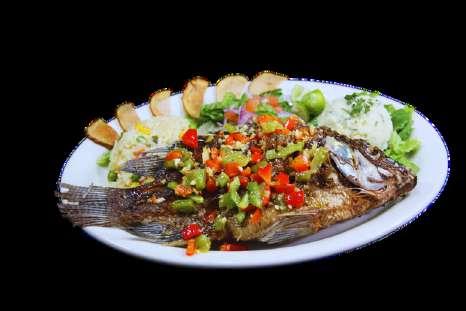 Mojarra al mojo de ajo, pimientos rojos con nuestra riquísima salsa de mantequilla y purred de papa
