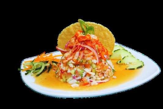 Tostada Ceviche de Camarón.......................................$11.99 arón cocido en jugo de limón Agrega aguacate por $2 50