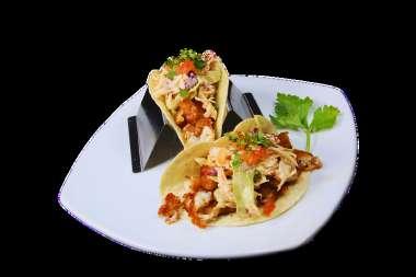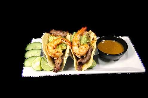 tacos con carne arrachera, camarón a la plancha y guacamole.