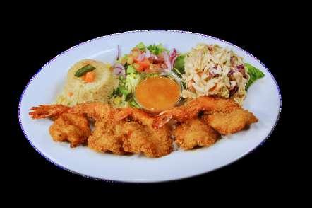 Camarones empanizados con arroz, ensalada de la casa y ensalada de col. Opcional puré de papa.