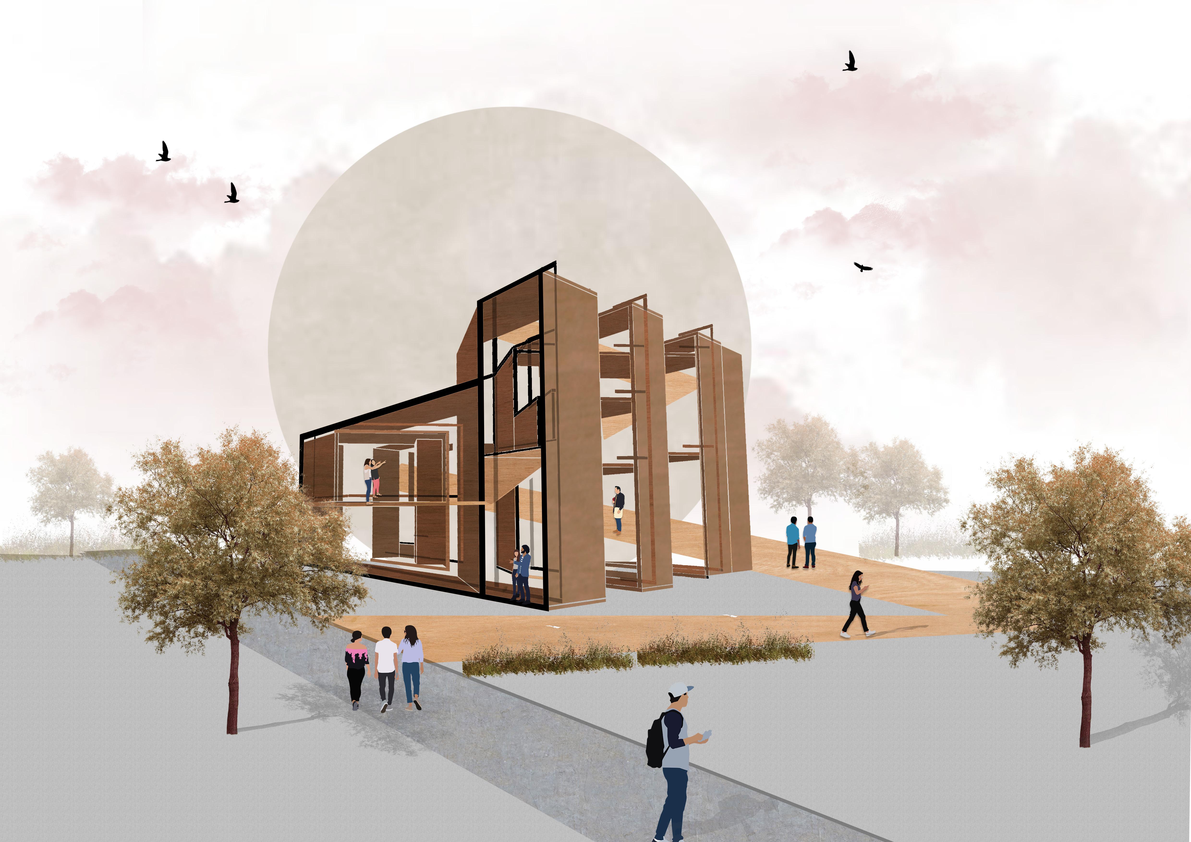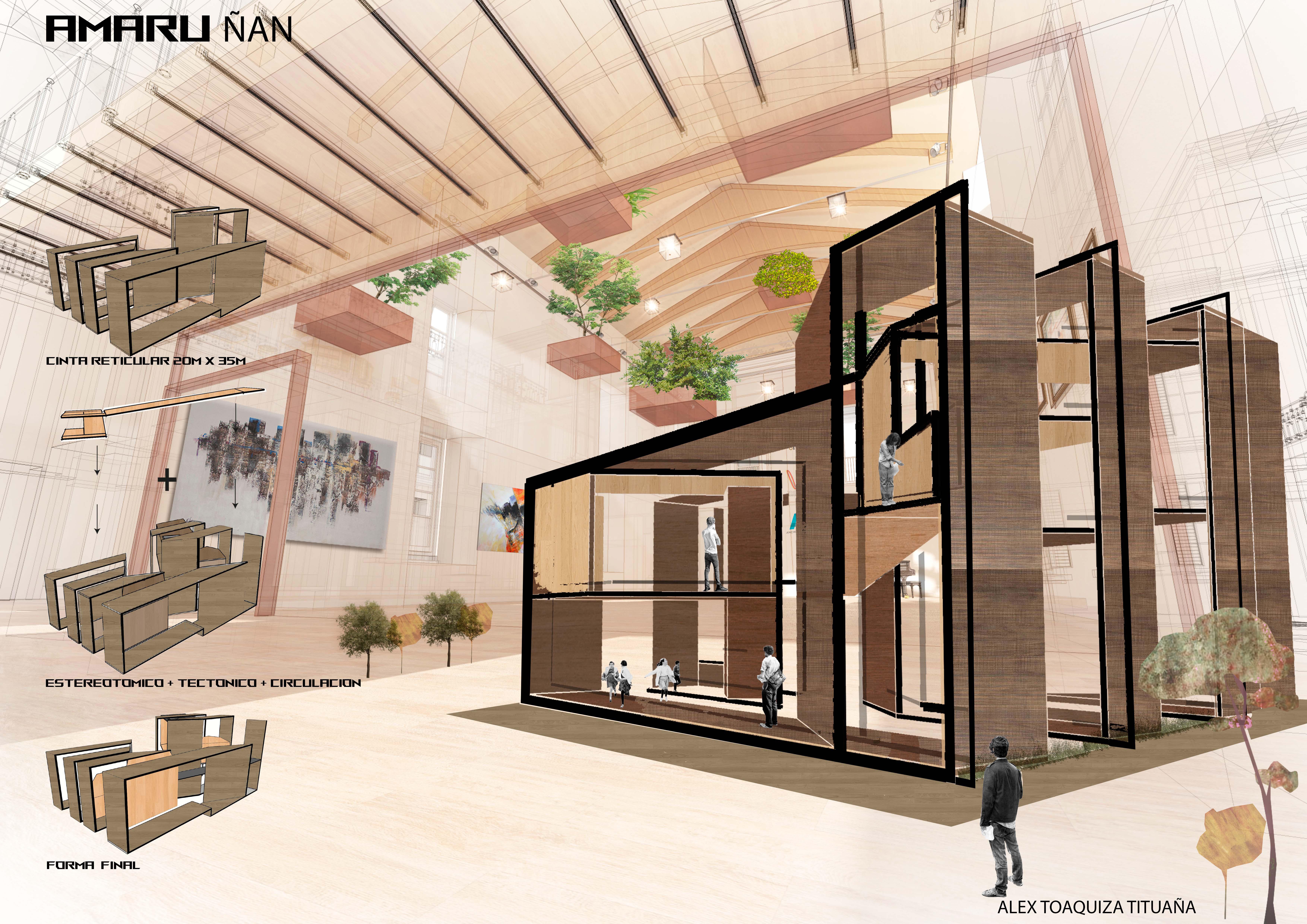 AMARUÑAN comparte equipamiento multifuncional dirigido a usuarios que quieran compartir y experimentar varias actividades a través de un sistema de cajas de plantas que se distribuye a través de un ritmo de altura relacionado con una cuadricula armónica. La grilla de cajas de plantas se conoce atreves de una rampa. De ser una simple rampa, se transforma en una circulación que permite crear un vinculo con el espacio y los usuarios; permitiendo experimentar a un viaje de paisajes en diferentes espacios y vistas desde lo alto. Este espacio es creado con el objetivo de promover los principios y valores humanos que se han desvaneciendo con el pasar el tiempo, Como el simple hecho de compartir palabras en una cafetería. Con esto fomenta el fortalecimiento de la comunicación para tener una sociedad segura.