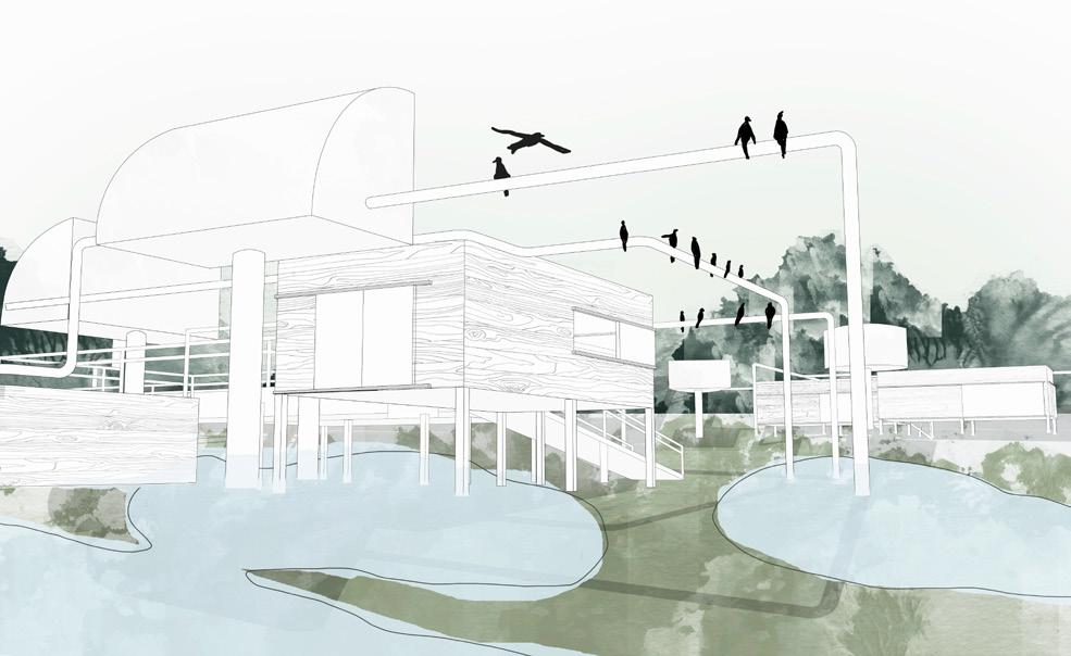 4 .Νεροδιαβιβαστής O νεροδιαβιβαστής βρίσκεται στη περιοχή της Λίμνης Πλαστήρα και τοποθετείται κοντά στο χωριό Αγιος Αθανάσιος, πάνω στο μεταβαλλόμενο όριο της λίμνης. Πρόκειται για ένα κτήριο-μηχανή, μία εγκατάσταση σε μορφή δικτύου, η οποία αποτελείται από σωλήνες και δεξαμενές που μεταφέρουν, συλλέγουν, αντλούν, διαχέουν και γενικά ελέγχουν και διαχιρείζονται τη ροή του νερού. Επειτα από την καταγραφή τριών βασικών σταδίων στάθμης του νερού, δημιουργούνται τρεις ζώνες πάνω στις οποίες τοποθετούνται τρεις διαφορετικοί τύποι-δίκτυα. Ο πρώτος τύπος, ο οποίος είναι τοποθετημένος στο μέρος όπου η επαφή με το νερό είναι